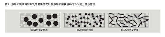 因此,當(dāng)PVC為30%時(shí),降低鈦白粉用量,配制白色液體油 墨,獲得總體不透明度最佳還是有可能的。該方法已成功應(yīng)用于 高光/半光涂料,適當(dāng)降低PVC含量,使用礦物填料優(yōu)化鈦白粉含量和不透明性(舉例參見文獻(xiàn)[5-8])。據(jù)報(bào)道,與粗顆粒和塊狀顆 粒相比,具有層狀結(jié)構(gòu)的細(xì)礦物顆粒(如高嶺土)更加有效,具 體效果見圖2所示,這種層狀顆粒可改善不透明度的原因在于TiO2 聚集體[9]較少,TiO2顆粒的吸收和粗糙效果[8]和TiO2顆?赡鼙婚g 隔,不過文獻(xiàn)中對(duì)所述效果仍存在不同觀點(diǎn)[10]。因此,本研究重 點(diǎn)是使用超細(xì)高嶺土優(yōu)化高TiO2含量的水性柔版印刷油墨配方,旨 在保持光澤和不透明度不變。