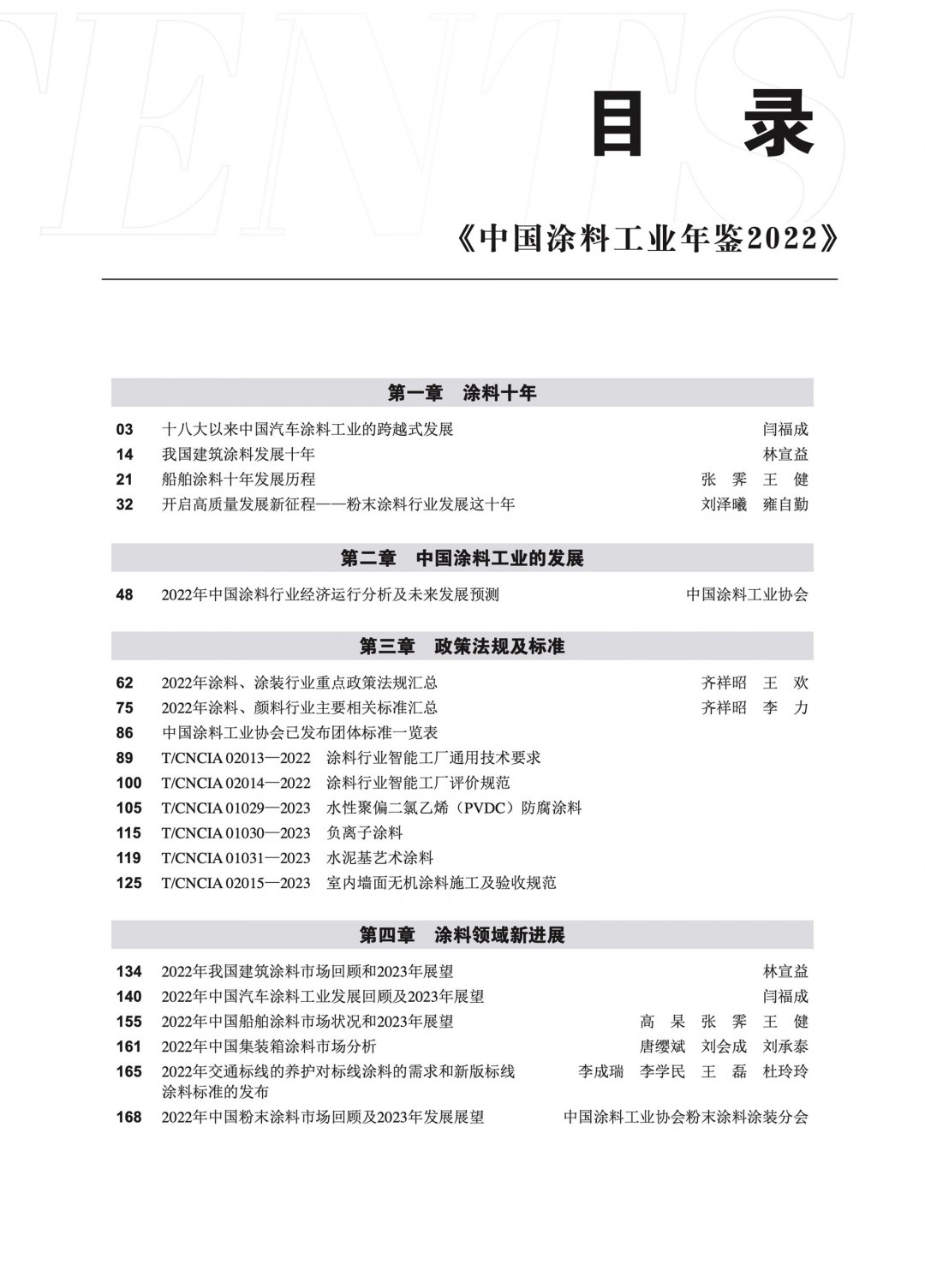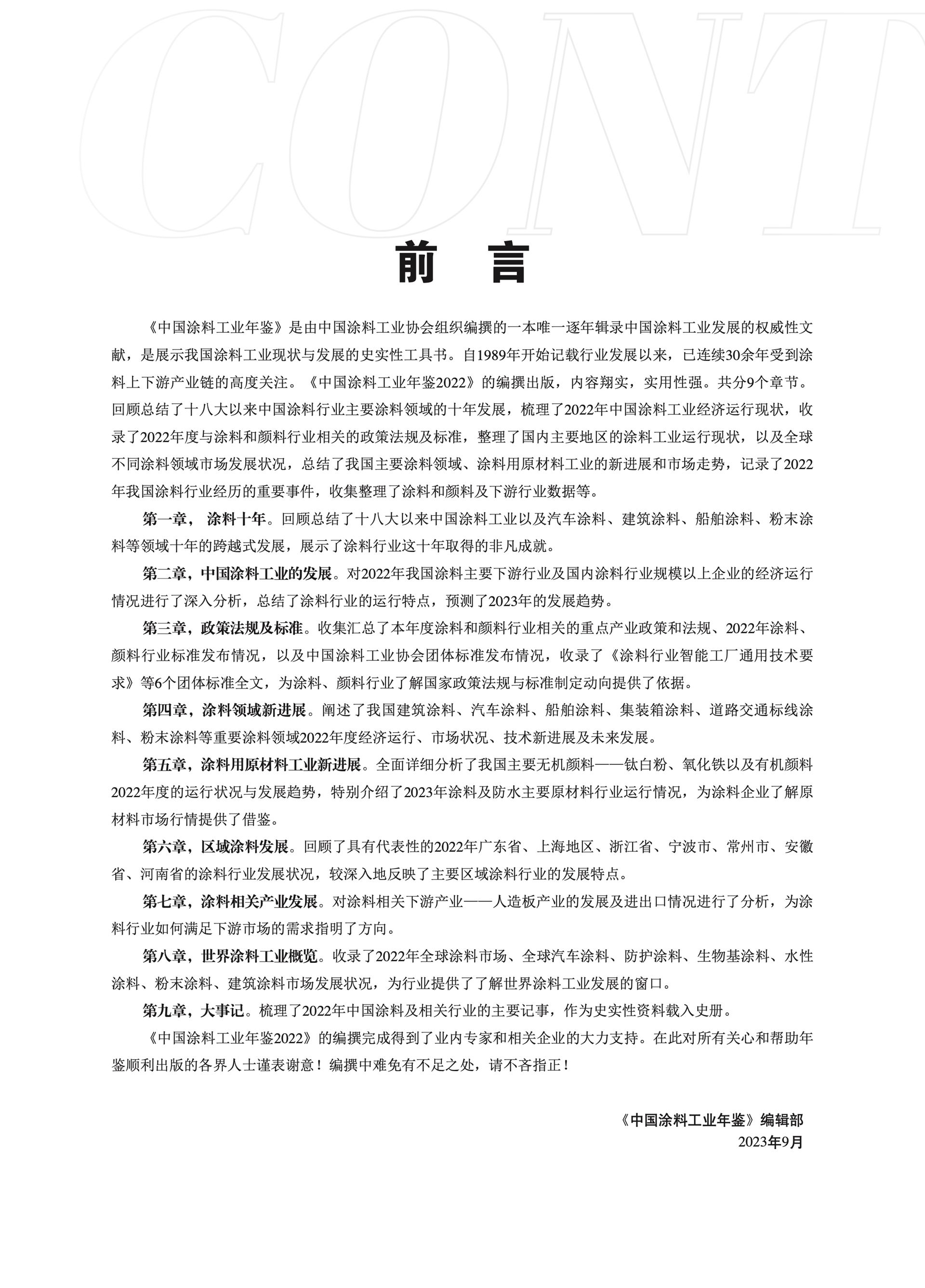 《中國涂料工業(yè)年鑒2022》的編撰出版,內(nèi)容翔實,實用性強(qiáng)。共分9個章節(jié)?;仡櫩偨Y(jié)了十八大以來中國涂料行業(yè)主要涂料領(lǐng)域的十年發(fā)展,梳理了2022年中國涂料工業(yè)經(jīng)濟(jì)運(yùn)行現(xiàn)狀,收錄了2022年度與涂料和顏料行業(yè)相關(guān)的政策法規(guī)及標(biāo)準(zhǔn),整理了國內(nèi)主要地區(qū)的涂料工業(yè)運(yùn)行現(xiàn)狀,以及全球不同涂料領(lǐng)域市場發(fā)展?fàn)顩r,總結(jié)了我國主要涂料領(lǐng)域、涂料用原材料工業(yè)的新進(jìn)展和市場走勢,記錄了2022年我國涂料行業(yè)經(jīng)歷的重要事件,收集整理了涂料和顏料及下游行業(yè)數(shù)據(jù)等。
