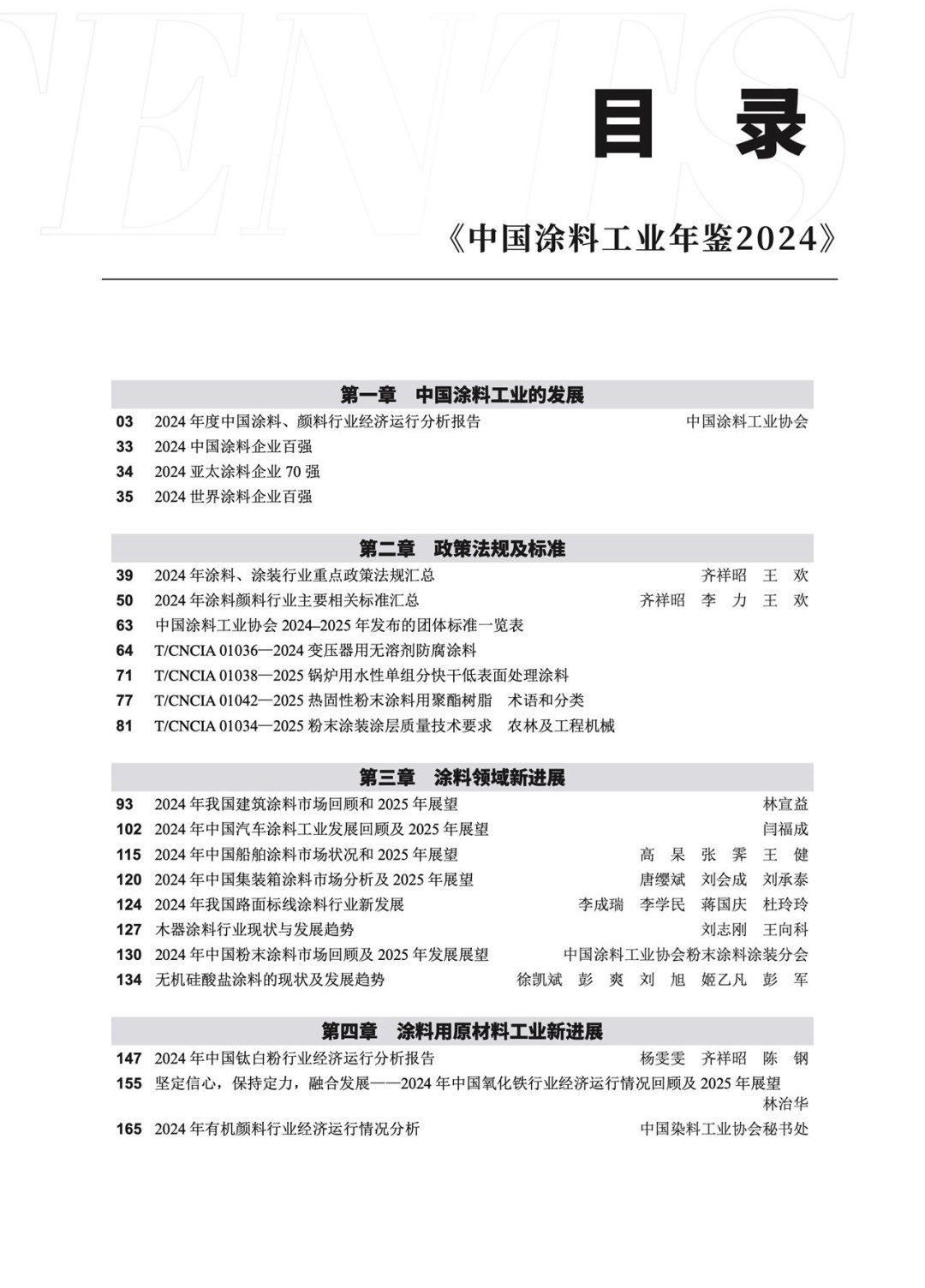 第二章,政策法規(guī)及標準。收集匯總了2024年度涂料和顏料行業(yè)相關的重點產業(yè)政策和法規(guī)、2024年涂料顏料國家標準、行業(yè)標準和團體標準發(fā)布情況,收錄了《變壓器用無溶劑防腐涂料》等4個團體標準全文,為涂料、顏料行業(yè)了解國家政策法規(guī)與標準制定提供了依據。