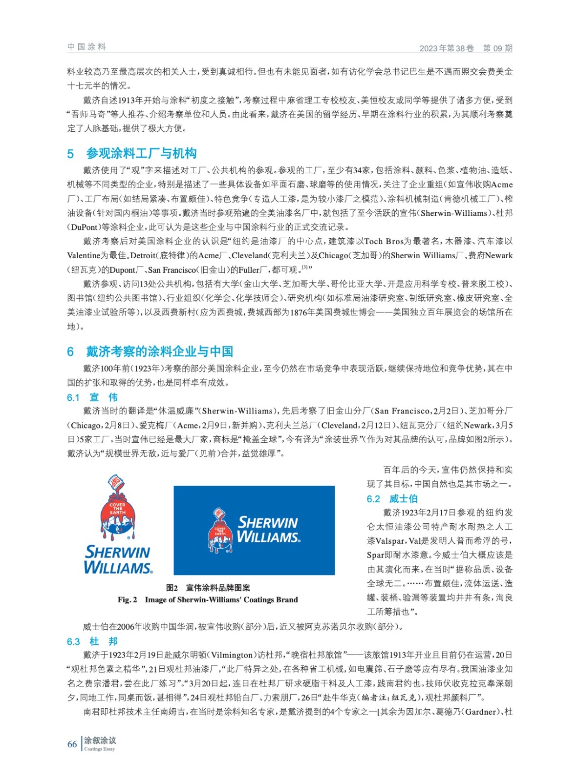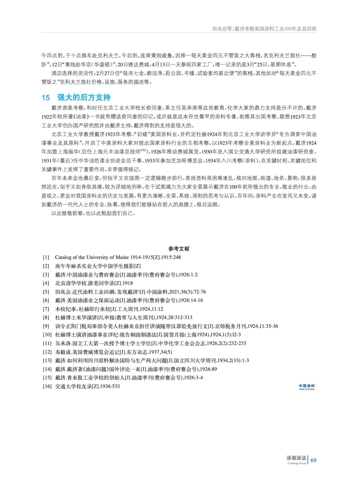 摘要:100年前的1923年,戴濟(jì)(字汝楫)考察美國涂料業(yè),時間跨度為1月31日至4月13日,歷時73天,主要沿舊金山–紐約一線,參觀至少34家工廠、13處公共機(jī)構(gòu),會晤37人,并寫成《游美紀(jì)程》一文,收錄在《油漆季刊(費(fèi)府賽會號)》中,在10月10日于上??偵虝唐逢惲兴谌握褂[會暨化學(xué)工藝展覽會(1923年)上,發(fā)表題為“美國油漆業(yè)之保面運(yùn)動”的演講,促成杜赫于1924年來華“專為調(diào)查中國油漆事業(yè)及其原料”,也由此開啟和奠定中美涂料業(yè)的相互交流的基礎(chǔ)。當(dāng)初這第一步走出去之時,正值我國從原始大漆、桐油開始轉(zhuǎn)型、現(xiàn)代涂料工業(yè)起步之際。此行作為中國涂料發(fā)展歷程的一個標(biāo)志性和重大活動,本應(yīng)是值得紀(jì)念的,由此再提和回視百年前的考察,也更應(yīng)有其價值和意義。