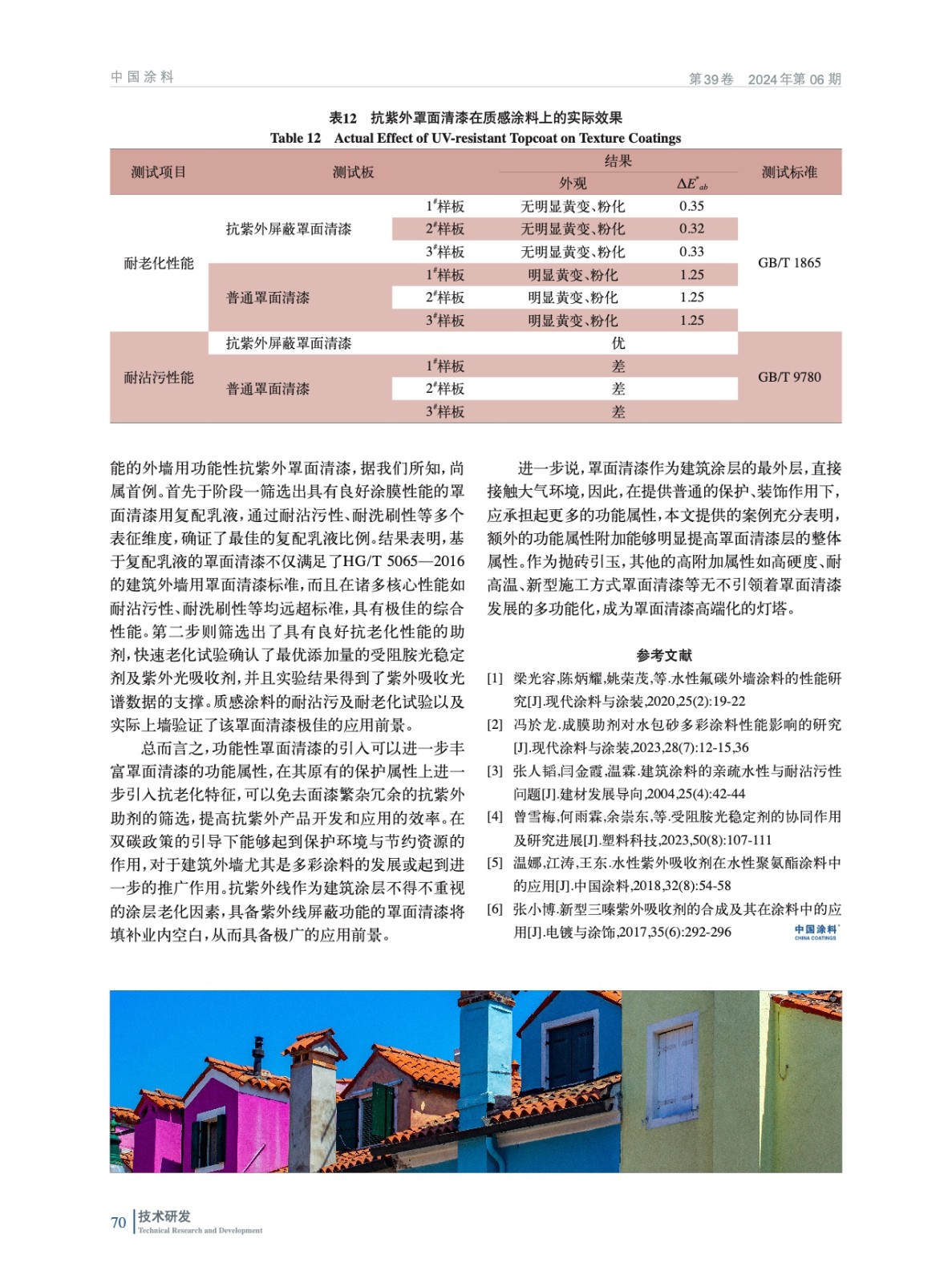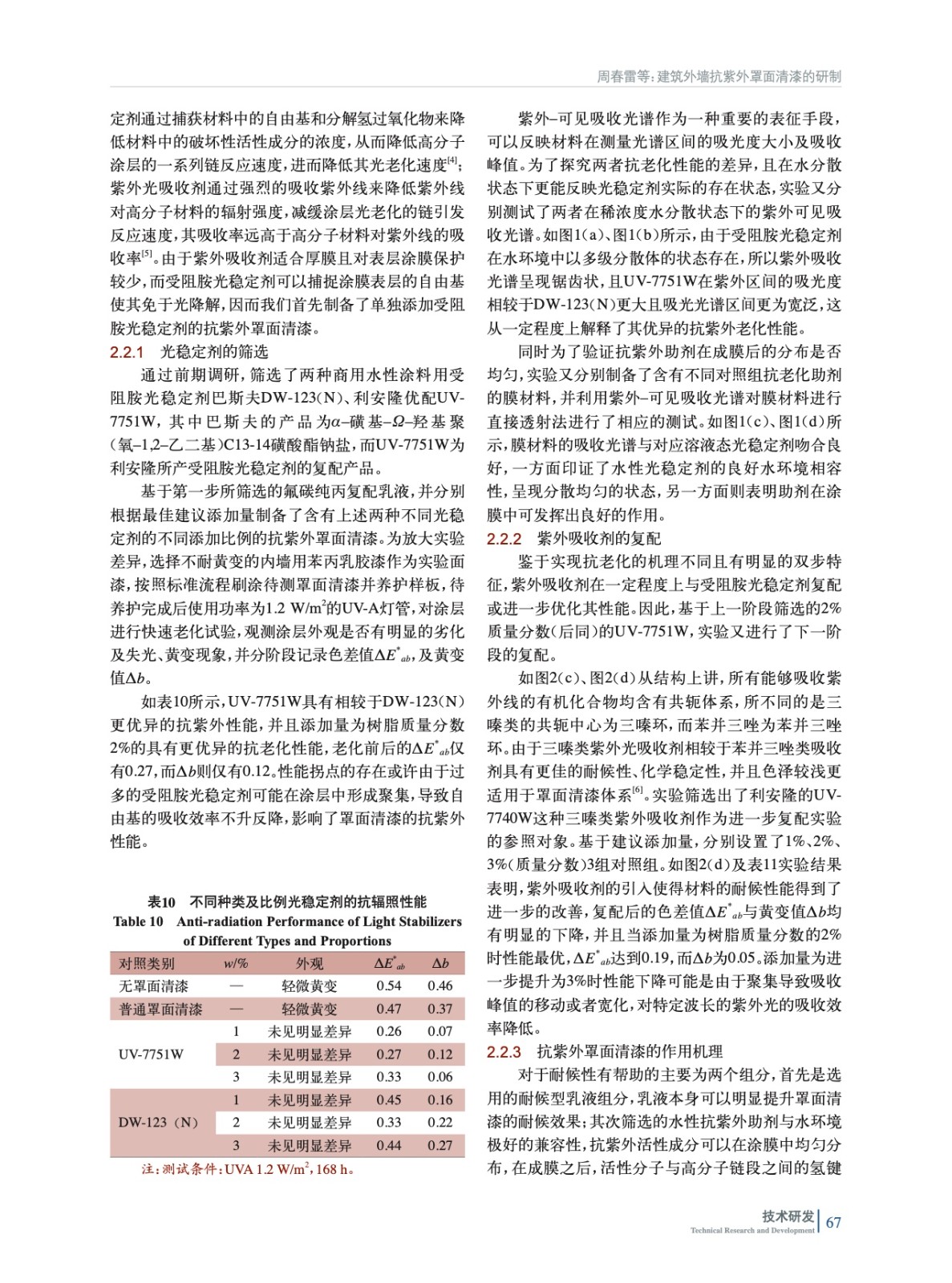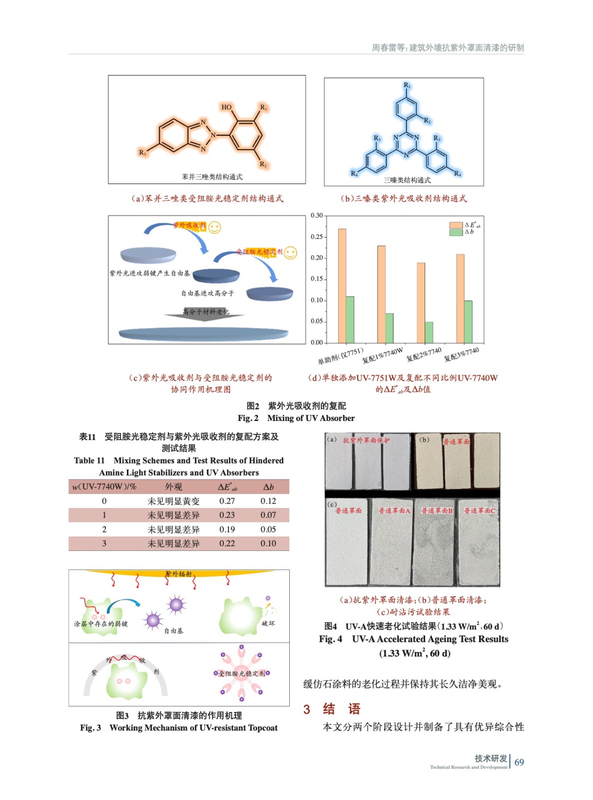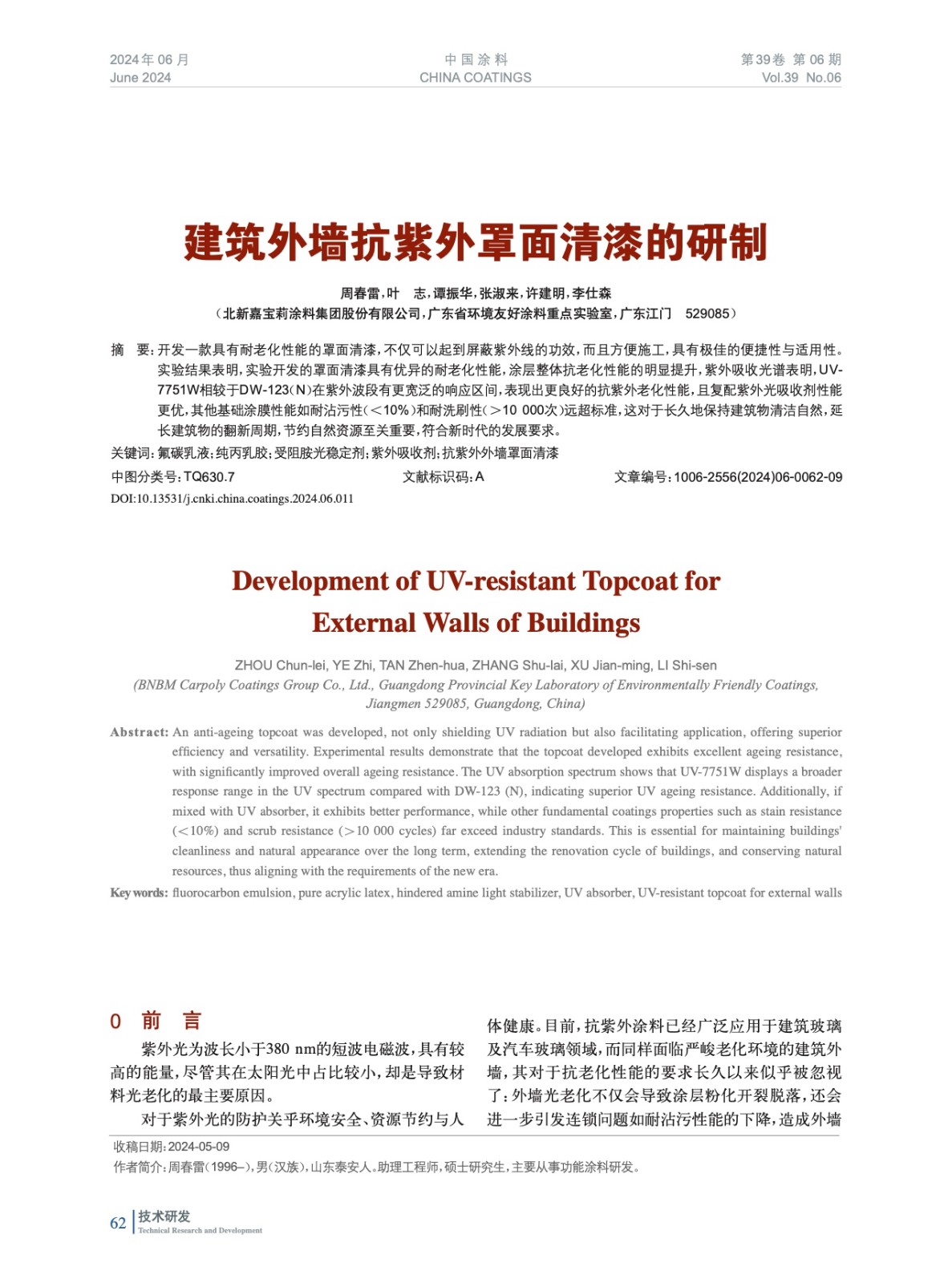 摘要:開發(fā)一款具有耐老化性能的罩面清漆,不僅可以起到屏蔽紫外線的功效,而且方便施工,具有極佳的便捷性與適用性。實(shí)驗(yàn)結(jié)果表明,實(shí)驗(yàn)開發(fā)的罩面清漆具有優(yōu)異的耐老化性能,涂層整體抗老化性能的明顯提升,紫外吸收光譜表明,UV-7751W相較于DW-123(N)在紫外波段有更寬泛的響應(yīng)區(qū)間,表現(xiàn)出更良好的抗紫外老化性能,且復(fù)配紫外光吸收劑性能更優(yōu),其他基礎(chǔ)涂膜性能如耐沾污性(<10%)和耐洗刷性(>10 000次)遠(yuǎn)超標(biāo)準(zhǔn),這對(duì)于長(zhǎng)久地保持建筑物清潔自然,延長(zhǎng)建筑物的翻新周期,節(jié)約自然資源至關(guān)重要,符合新時(shí)代的發(fā)展要求。