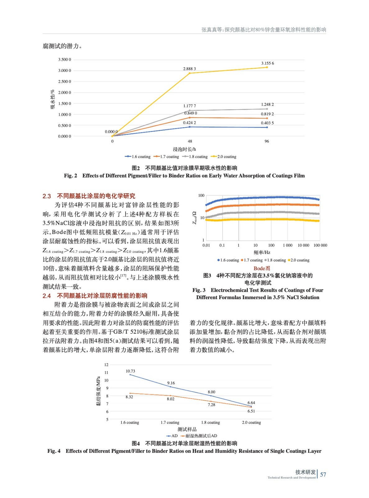 摘要:在80%鋅含量環(huán)氧涂料中,以長石粉作為另一種輔助顏填料,通過改變總顏填料與基料的比例(即顏基比),制備了臨界狀態(tài)附近4種不同顏基比(1.6、1.7、1.8以及2.0)的涂料樣品,并探究了顏基比對涂膜形成結構以及涂膜防腐蝕性能的影響。測試結果顯示,隨著顏基比的增加,4種測試涂層的吸水率增大,96 h泡水測試后,顏基比為2.0的涂層吸水率約為1.6顏基比涂層的7.8倍;電化學測試Bode圖中低頻阻抗模量(Z0.01 Hz)減小,1.6顏基比涂層的阻抗值約為2.0顏基比涂層阻抗值的10倍,意味著涂層的阻隔性能減弱;連續(xù)冷凝、耐鹽霧以及耐濕熱防腐測試后涂膜的附著力均有所降低,表明了涂膜的防腐性能降低。盡管顏基比越高涂料的價格降低,但從環(huán)氧富鋅底漆應具備良好的防銹性能再追求性價比的角度考慮,顏基比建議不高于2.0,以確保防腐測試后涂層仍具有優(yōu)異的附著力(不低于5 MPa)。