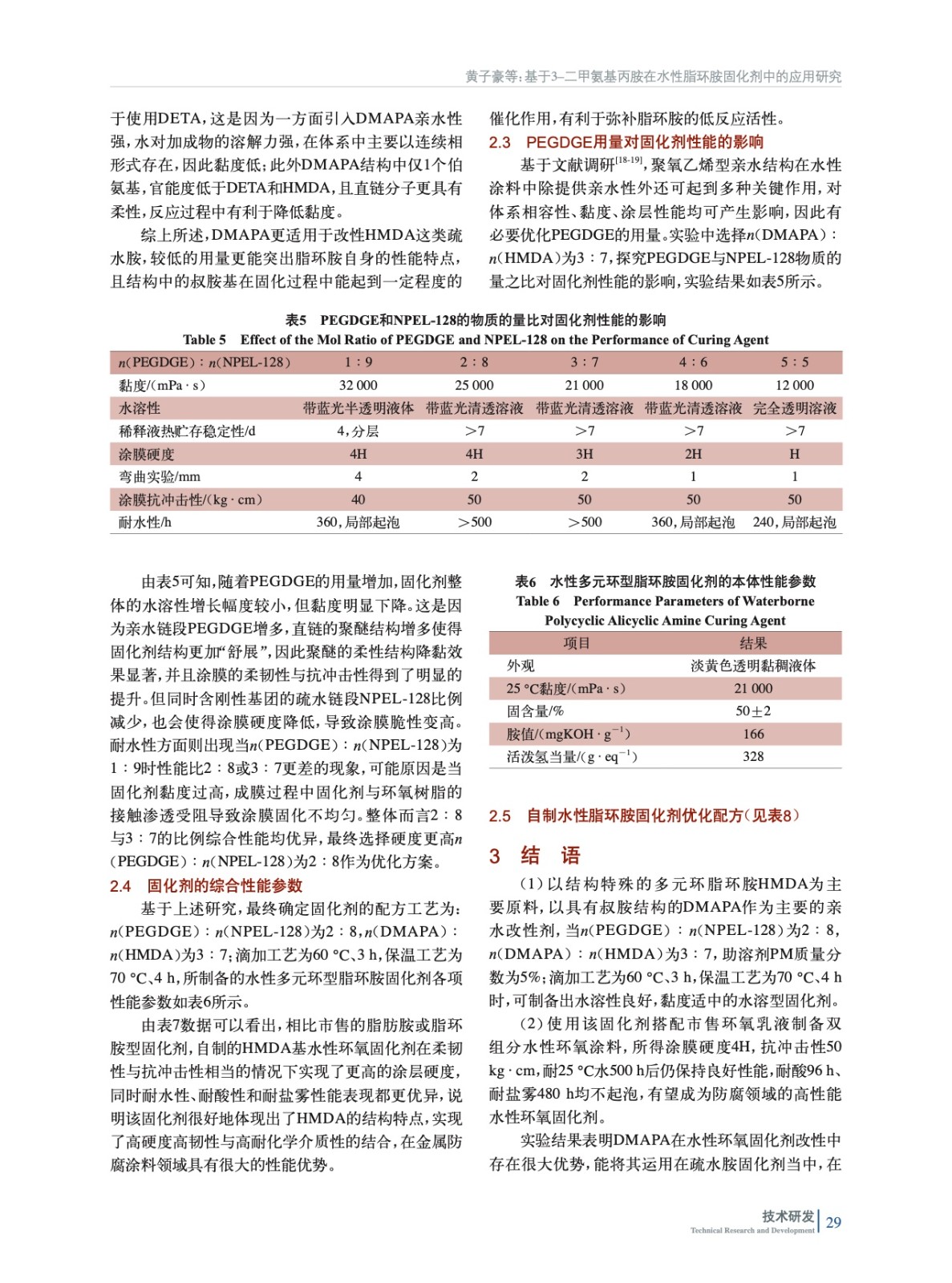 摘要:為了解決脂環(huán)胺在環(huán)氧固化劑中水性化的難點,以4,4'–二氨基二環(huán)己基甲烷(H12MDA)為基礎(chǔ)胺,1,3–丙二胺(DMAPA)兼作親水改性劑,與液體環(huán)氧樹脂(NPEL-128)和聚乙二醇二縮水甘油醚(PEGDGE)合成水性環(huán)氧固化劑,同時設(shè)置對照組以二亞乙基三胺(DETA)作為親水改性劑,探究了具有叔胺結(jié)構(gòu)的1,3–丙二胺(DMAPA)對HMDA的親水改性效果,優(yōu)化了非離子親水?dāng)U鏈劑聚乙二醇二縮水甘油醚(PEGDGE)的用量。結(jié)果表明,DMAPA的親水性遠(yuǎn)高于二亞乙基三胺為代表的常規(guī)脂肪胺,所得固化劑黏度適中、水溶性良好,固化劑制備所得涂膜具有高硬度、高耐沖擊性及優(yōu)異的耐水、耐鹽霧性能。