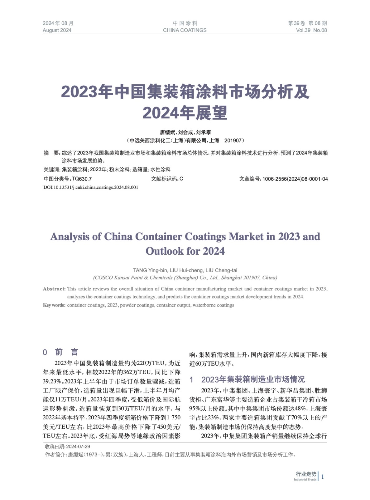 摘要:綜述了2023年我國集裝箱制造業(yè)市場和集裝箱涂料市場總體情況,并對集裝箱涂料技術(shù)進(jìn)行分析,預(yù)測了2024年集裝箱涂料市場發(fā)展趨勢。