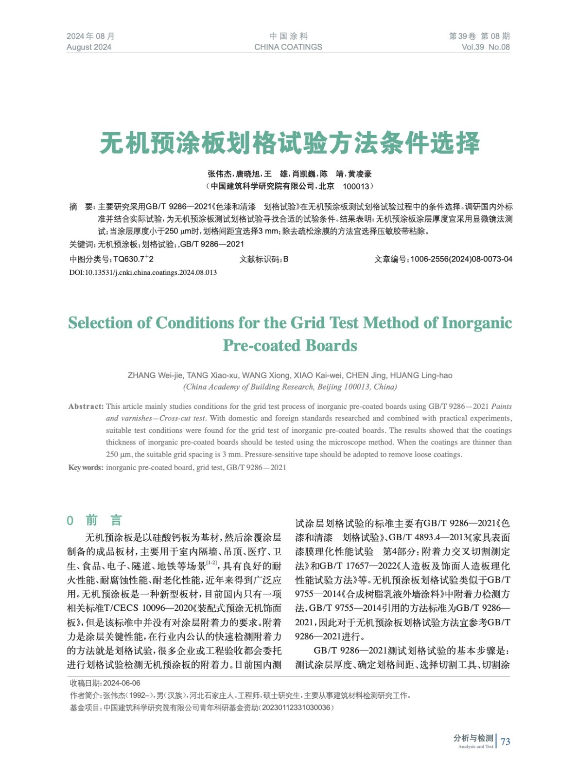 摘要:主要研究采用GB/T 9286—2021《色漆和清漆 劃格試驗(yàn)》在無(wú)機(jī)預(yù)涂板測(cè)試劃格試驗(yàn)過(guò)程中的條件選擇。調(diào)研國(guó)內(nèi)外標(biāo)準(zhǔn)并結(jié)合實(shí)際試驗(yàn),為無(wú)機(jī)預(yù)涂板測(cè)試劃格試驗(yàn)尋找合適的試驗(yàn)條件。結(jié)果表明:無(wú)機(jī)預(yù)涂板涂層厚度宜采用顯微鏡法測(cè)試;當(dāng)涂層厚度小于250 μm時(shí),劃格間距宜選擇3 mm;除去疏松涂膜的方法宜選擇壓敏膠帶粘除。