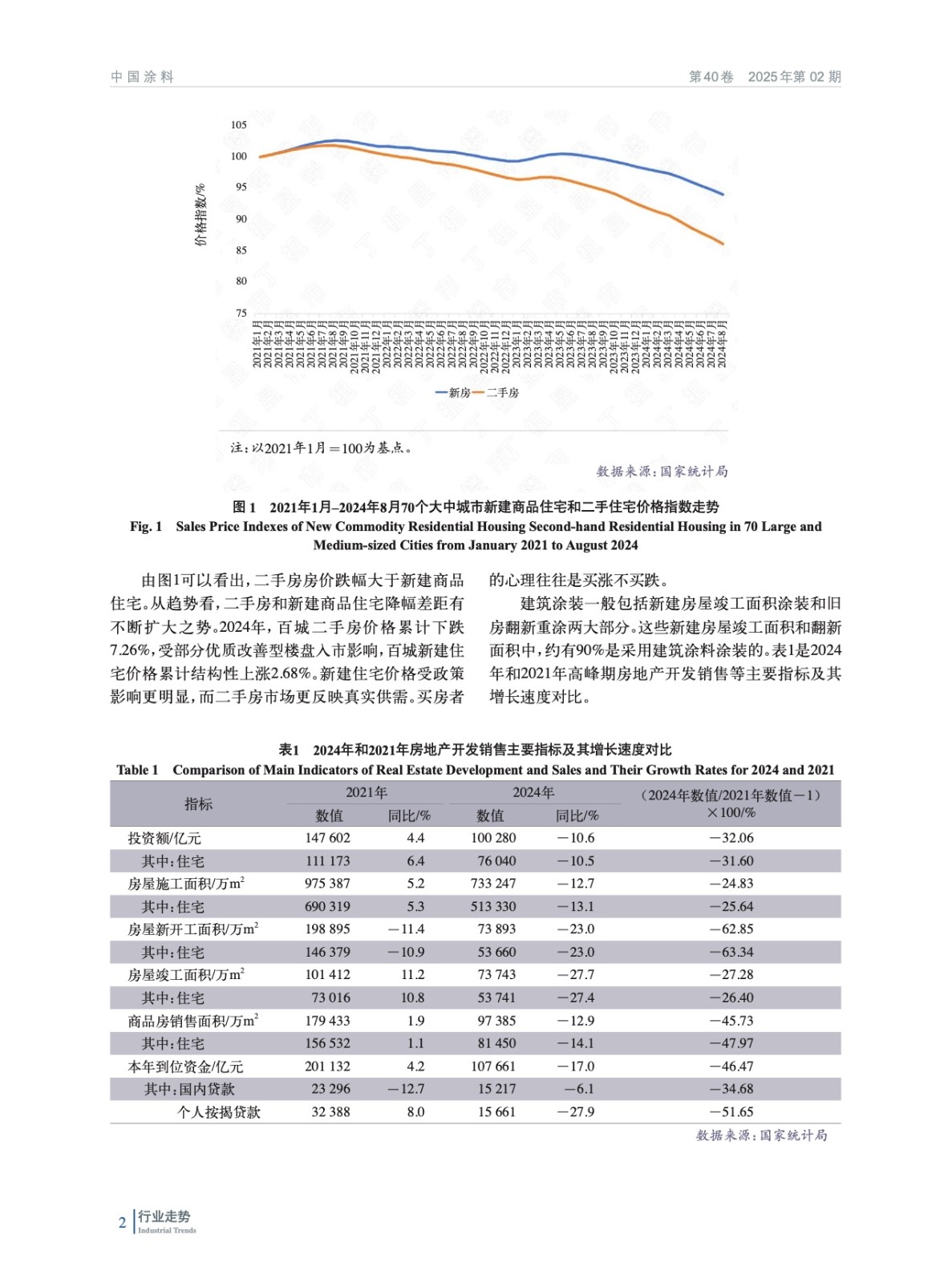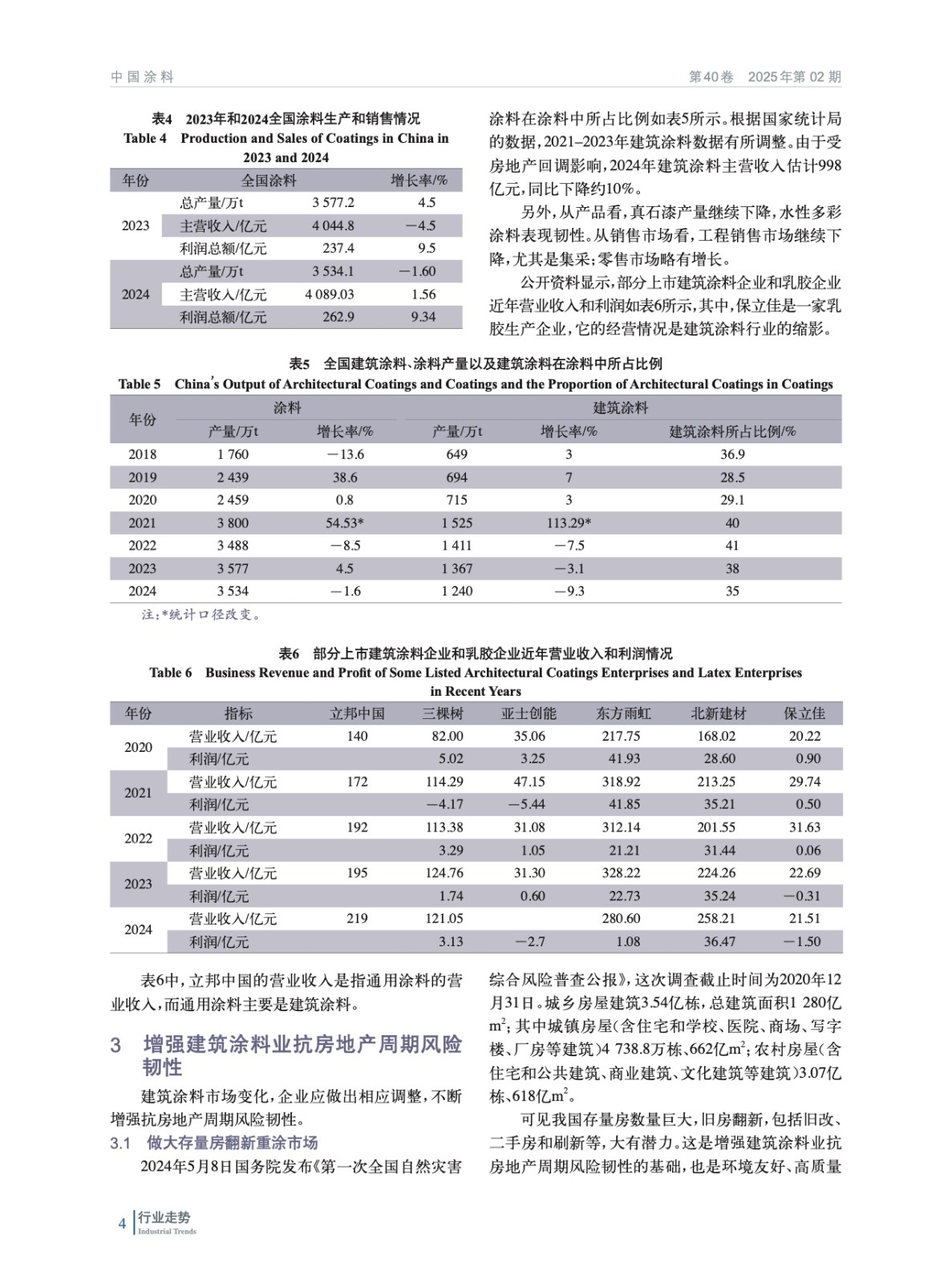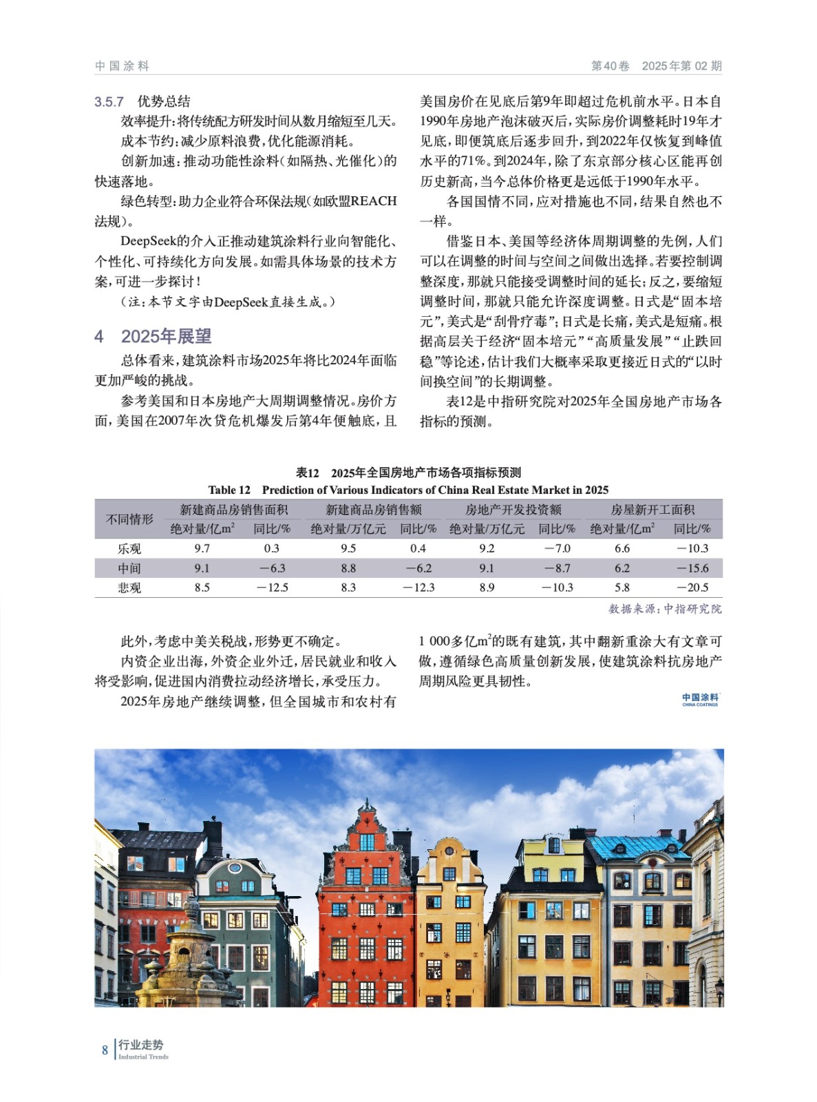 摘要:介紹了2024年我國房地產(chǎn)行業(yè)和建筑涂料市場發(fā)展狀況,總結(jié)了建筑涂料2024年產(chǎn)銷現(xiàn)狀,指出在當(dāng)前形勢下,要增強建筑涂料業(yè)抗房地產(chǎn)周期風(fēng)險韌性,做大存量房翻新重涂市場,做強仿石涂料拳頭產(chǎn)品,擁抱綠色節(jié)能潮流,創(chuàng)新建筑涂料發(fā)展,開發(fā)DeepSeek等在建筑涂料領(lǐng)域的應(yīng)用,最后對2025年建筑涂料市場進行了展望。
