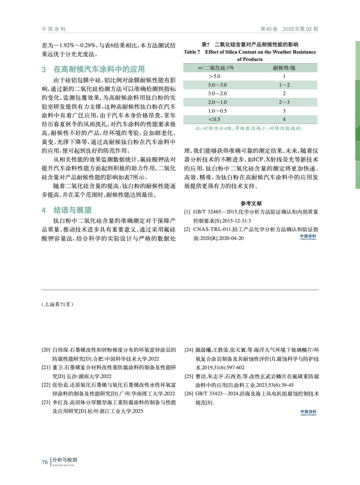 摘要:開(kāi)發(fā)氟硅酸鉀法測(cè)定鈦白粉二氧化硅含量的新方法,通過(guò)人員、儀器設(shè)備、標(biāo)準(zhǔn)物質(zhì)、試劑、環(huán)境條件的確認(rèn)和正確度試驗(yàn)、精密度試驗(yàn)、回收率的方法特性確認(rèn),完成方法開(kāi)發(fā)。該方法的開(kāi)發(fā)克服了研發(fā)過(guò)程中硅、鋁比例高、結(jié)果檢測(cè)不穩(wěn)定的問(wèn)題,確保了良好的硅鋁比例,可以很好地保證鈦白粉在不同應(yīng)用領(lǐng)域中適用性,確保高耐候性能涂料用鈦白粉的研發(fā)和產(chǎn)業(yè)化,推動(dòng)涂料行業(yè)高技術(shù)發(fā)展。