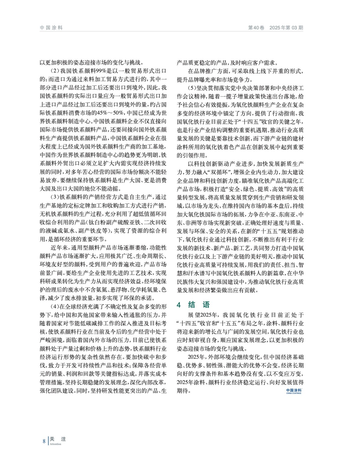 摘要:綜述了當(dāng)前中國(guó)氧化鐵行業(yè)、企業(yè)的綠色、創(chuàng)新發(fā)展現(xiàn)狀,指出2024年國(guó)內(nèi)氧化鐵顏料產(chǎn)業(yè)貿(mào)易呈現(xiàn)出多變轉(zhuǎn)向,并對(duì)未來(lái)行業(yè)發(fā)展進(jìn)行了建議和展望。
