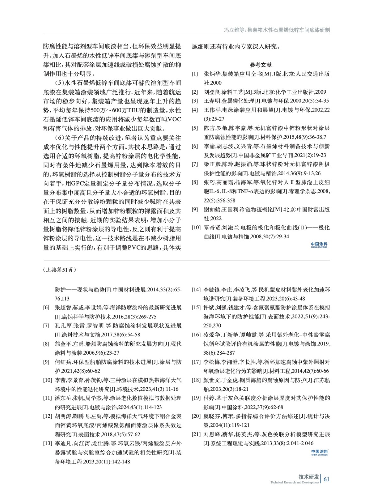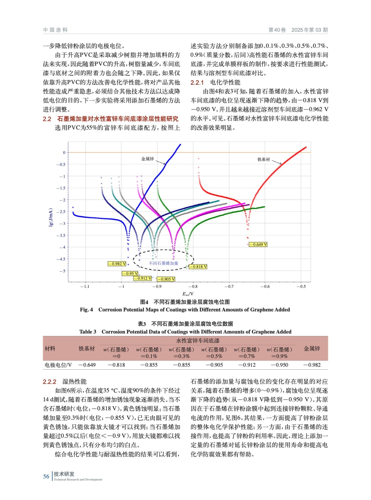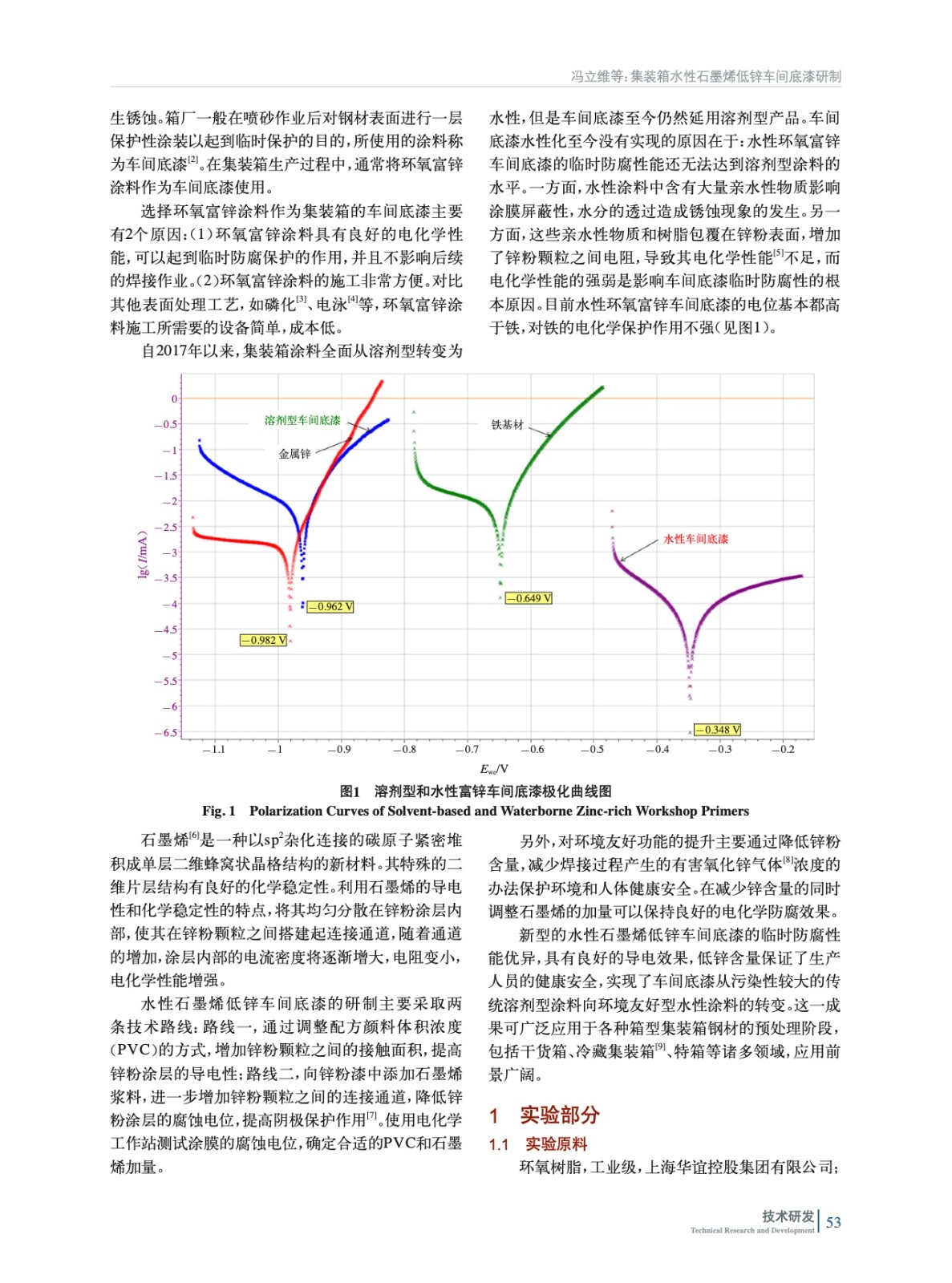 摘要:研制一款用于集裝箱的水性石墨烯低鋅車間底漆,使其性能與溶劑型車間底漆相當,并具有明顯的環(huán)境友好優(yōu)勢。通過減少鋅含量的方法降低有害氣體濃度,保護人體健康安全。鋅含量降低導致電化學性能下降的問題,可通過調(diào)整鋅粉漆顏料體積濃度(PVC),同時添加一定量石墨烯的方法加以改善,使最終性能接近溶劑型車間底漆的水平,并滿足其臨時防腐的設計要求。將鋅粉漆配方的PVC調(diào)整至55%,鋅粉含量調(diào)整至50%(質(zhì)量分數(shù),后同),石墨烯加量0.7%,得到的車間底漆涂層的電極電位小于-0.8 V,經(jīng)過35 ℃濕熱環(huán)境2周的測試,沒有出現(xiàn)銹蝕現(xiàn)象,通過了臨時防腐性能的測試要求。其配套涂層的耐鹽霧性能與溶劑型車間底漆相當,加速線擴蝕速度明顯減緩。在滿足其設計要求的基礎上實現(xiàn)了保護環(huán)境和人體健康安全的目的。