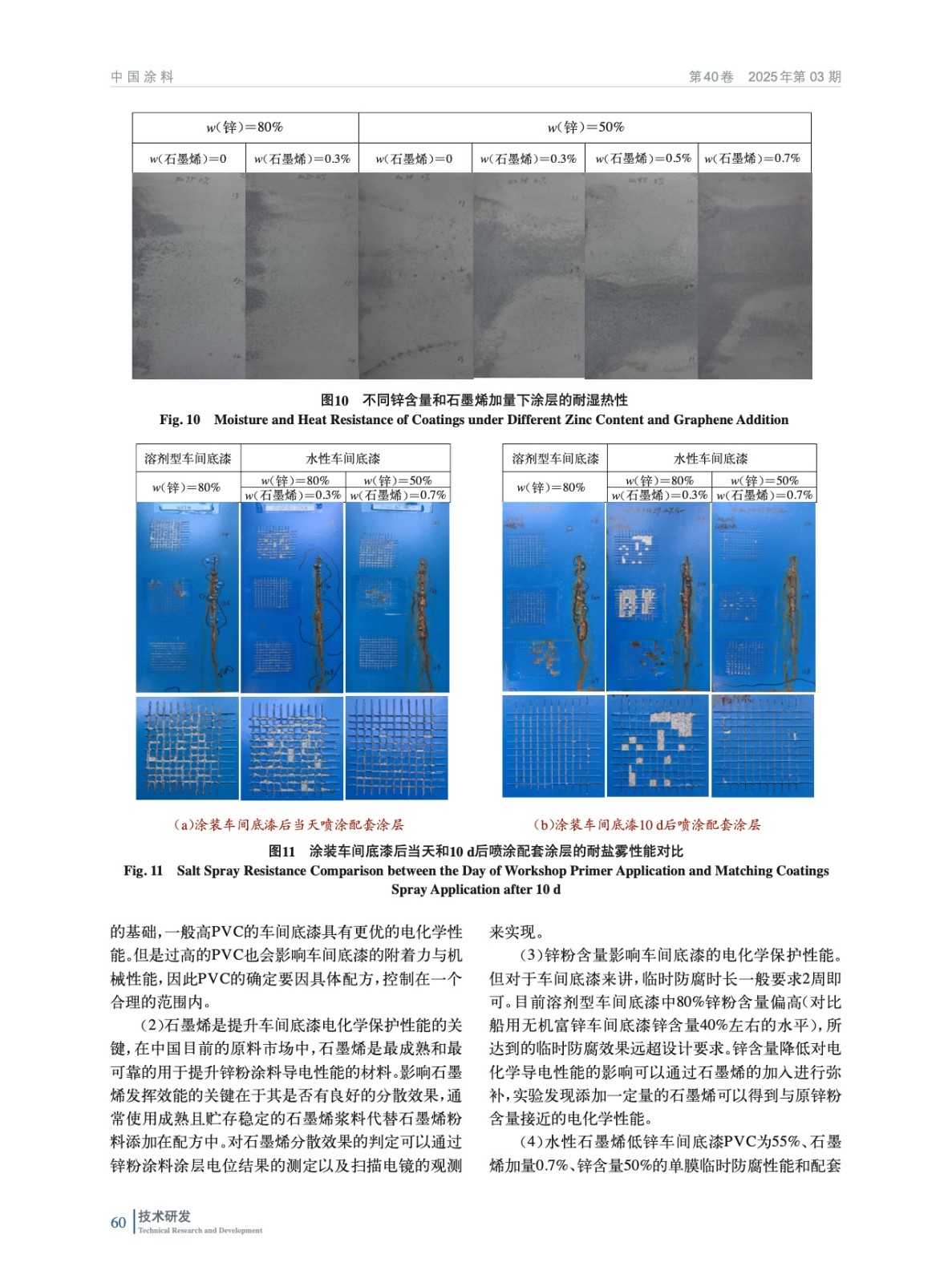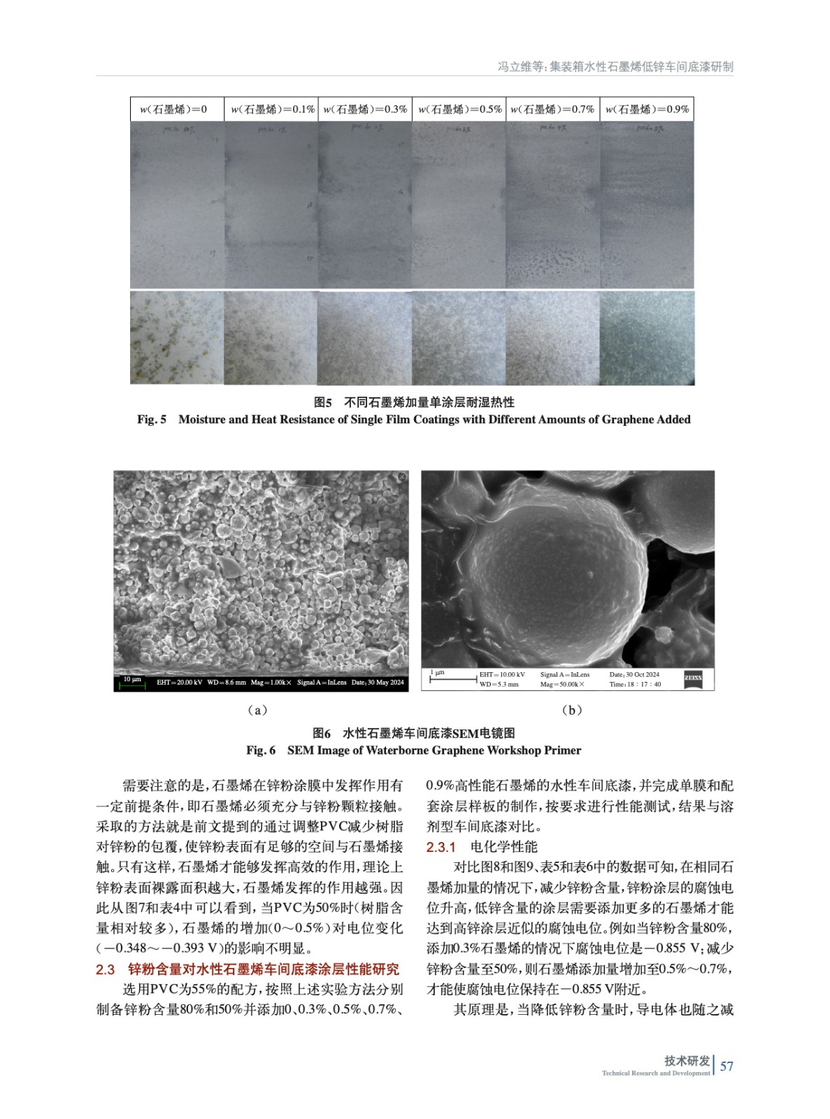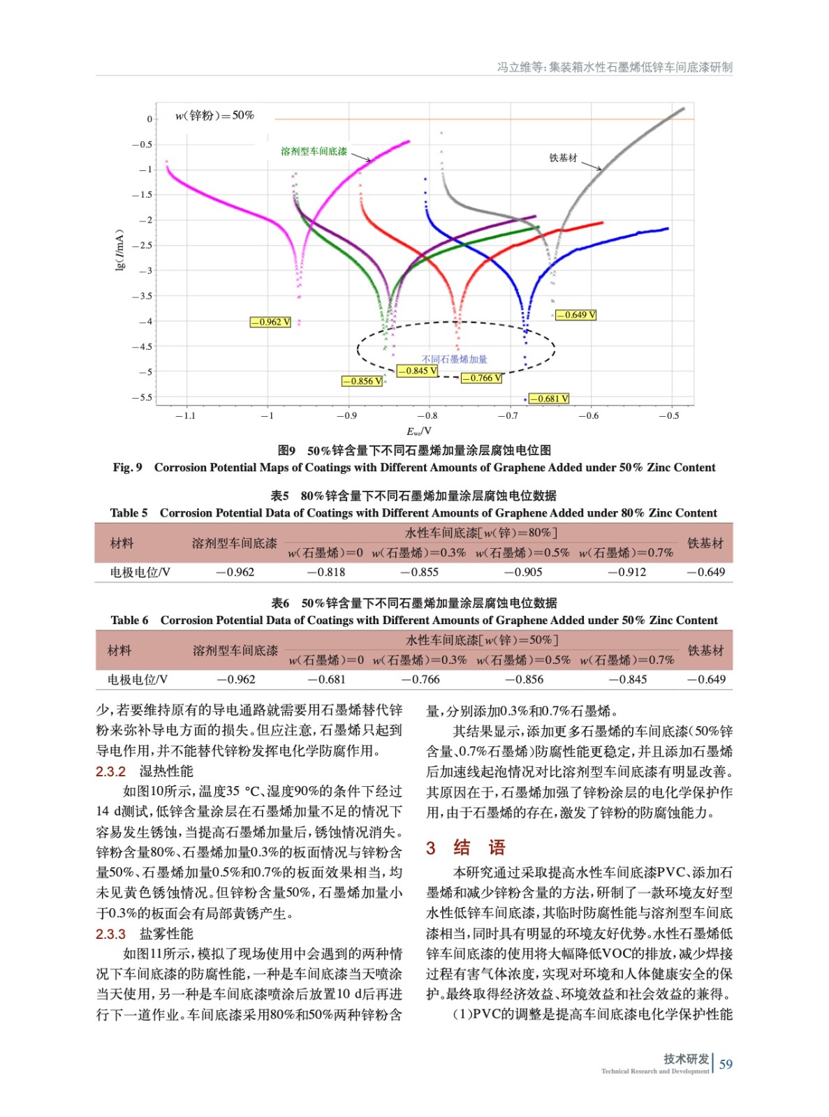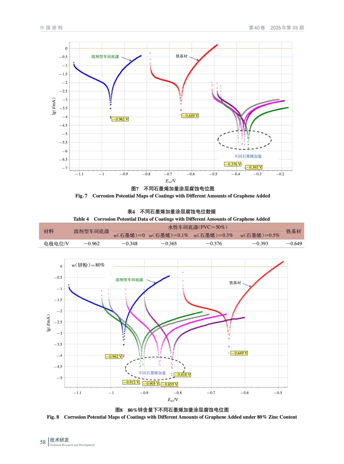 摘要:研制一款用于集裝箱的水性石墨烯低鋅車間底漆,使其性能與溶劑型車間底漆相當,并具有明顯的環(huán)境友好優(yōu)勢。通過減少鋅含量的方法降低有害氣體濃度,保護人體健康安全。鋅含量降低導致電化學性能下降的問題,可通過調(diào)整鋅粉漆顏料體積濃度(PVC),同時添加一定量石墨烯的方法加以改善,使最終性能接近溶劑型車間底漆的水平,并滿足其臨時防腐的設計要求。將鋅粉漆配方的PVC調(diào)整至55%,鋅粉含量調(diào)整至50%(質(zhì)量分數(shù),后同),石墨烯加量0.7%,得到的車間底漆涂層的電極電位小于-0.8 V,經(jīng)過35 ℃濕熱環(huán)境2周的測試,沒有出現(xiàn)銹蝕現(xiàn)象,通過了臨時防腐性能的測試要求。其配套涂層的耐鹽霧性能與溶劑型車間底漆相當,加速線擴蝕速度明顯減緩。在滿足其設計要求的基礎上實現(xiàn)了保護環(huán)境和人體健康安全的目的。