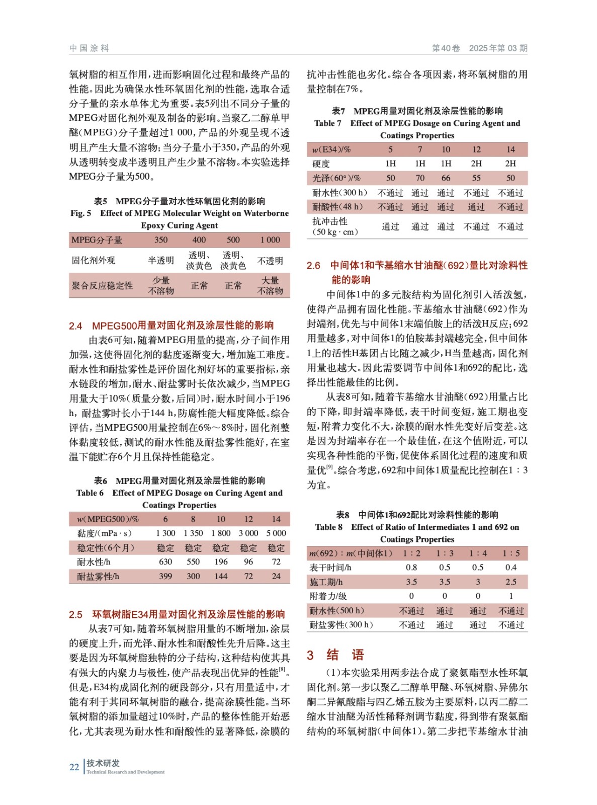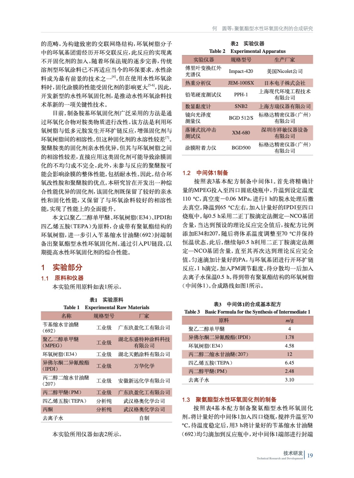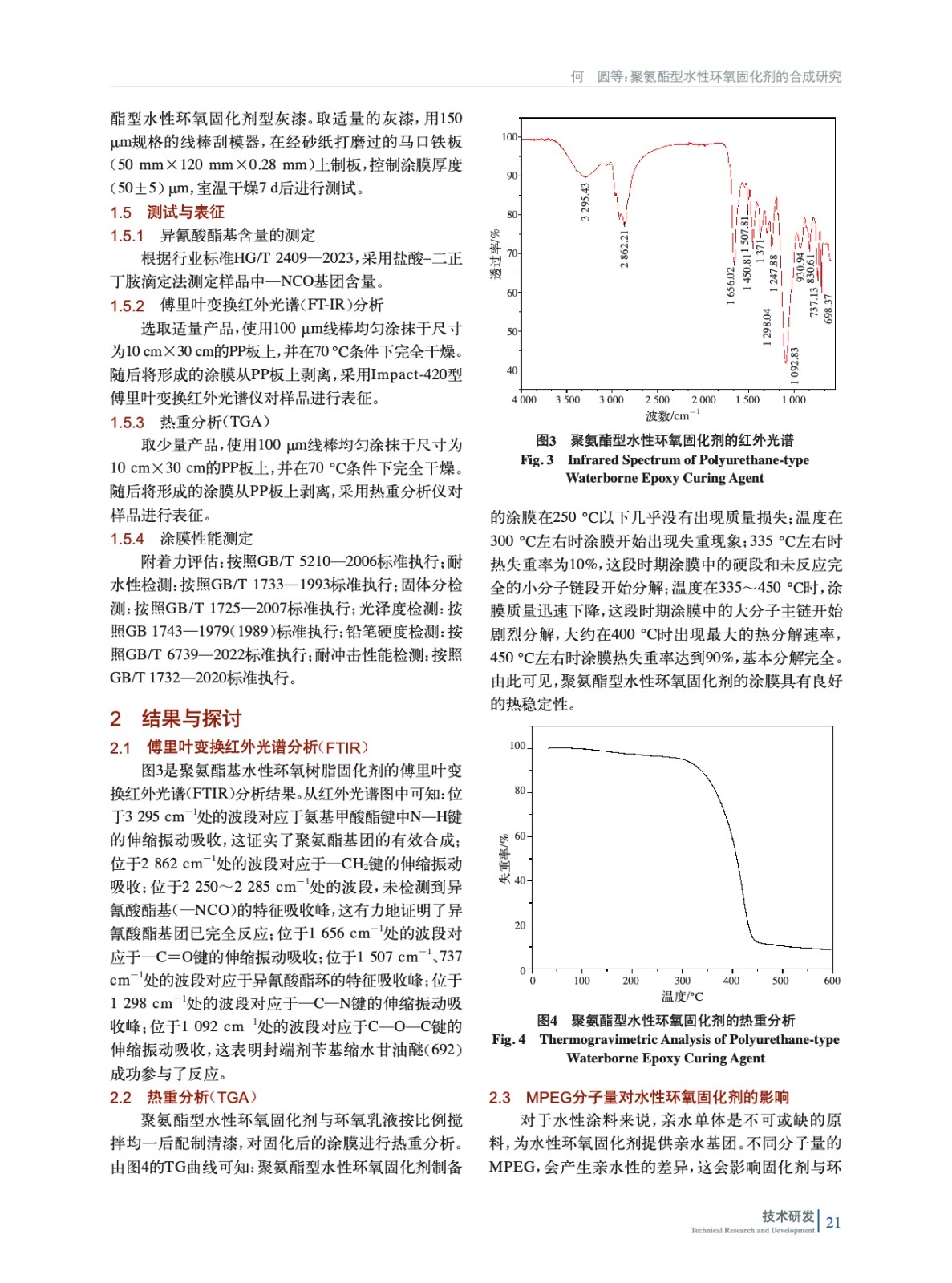 摘要:用聚乙二醇單甲醚(MPEG)、環(huán)氧樹脂(E34)與異佛爾酮二異氰酸酯(IPDI)反應,加入活性稀釋劑丙二醇二縮水甘油醚(207)調(diào)整體系的黏度,得到帶有聚氨酯結構的環(huán)氧樹脂,再加入四乙烯五胺(TEPA)合成得到環(huán)氧改性胺(中間體1),選用芐基縮水甘油醚(692)作為封端劑與合成的中間體1反應,成功制備得到聚氨酯型水性環(huán)氧固化劑。采用傅里葉變換紅外光譜(FT-IR)、熱重分析(TGA)對產(chǎn)品和涂膜進行測試及表征;同時,考察聚乙二醇單甲醚種類和用量、環(huán)氧樹脂用量、692和中間體1配比對固化劑和涂料性能的影響。結果表明:聚乙二醇單甲醚的分子量為500、質(zhì)量分數(shù)6%~8%,環(huán)氧樹脂質(zhì)量分數(shù)7%~9%,m(692)∶m(中間體1)為1∶3,合成的固化劑貯存穩(wěn)定性好,且制備的涂膜也具有較好的耐水性、附著力、硬度等性能。