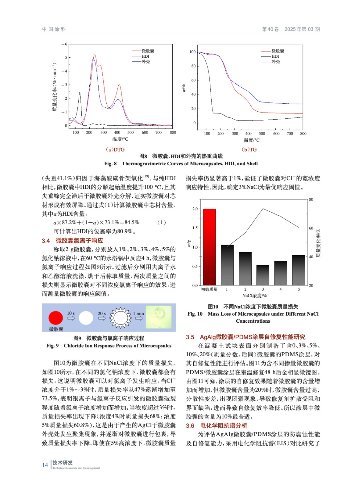 摘要:利用海藻酸鈉為壁材原料,六亞甲基二異氰酸酯為芯材原料,通過(guò)內(nèi)源乳化法制備海藻酸銀(AgAlg)微膠囊,通過(guò)控制不同碳酸銀含量和稀硝酸濃度、進(jìn)料速度探討了微膠囊最佳合成工藝,對(duì)微膠囊形貌、化學(xué)結(jié)構(gòu)、熱穩(wěn)定性及芯材含量進(jìn)行了研究,并通過(guò)微膠囊觸發(fā)微膠囊響應(yīng)氯離子濃度進(jìn)行表征。將微膠囊加入PDMS涂層,制備AgAlg微膠囊/PDMS自修復(fù)涂層,對(duì)其進(jìn)行劃痕試驗(yàn)和電化學(xué)阻抗分析,通過(guò)與PDMS涂層相對(duì)比,結(jié)果表明氯離子響應(yīng)微膠囊具有較強(qiáng)的自修復(fù)能力。