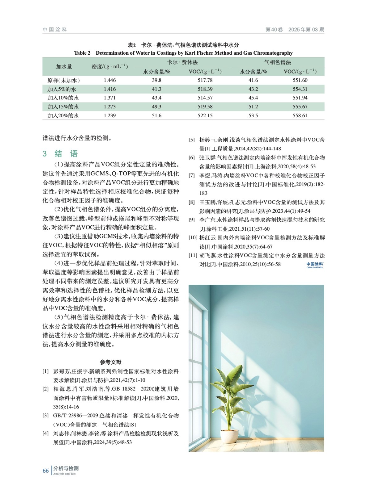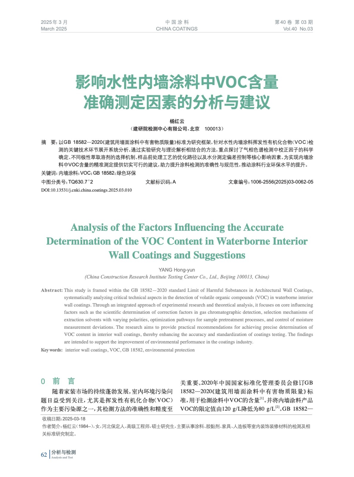 摘要:以GB 18582—2020《建筑用墻面涂料中有害物質(zhì)限量》標(biāo)準(zhǔn)為研究框架,針對(duì)水性內(nèi)墻涂料揮發(fā)性有機(jī)化合物(VOC)檢測(cè)的關(guān)鍵技術(shù)環(huán)節(jié)展開系統(tǒng)分析。通過實(shí)驗(yàn)研究與理論解析相結(jié)合的方法,重點(diǎn)探討了氣相色譜檢測(cè)中校正因子的科學(xué)確定、不同極性萃取溶劑的選擇機(jī)制、樣品前處理工藝的優(yōu)化路徑以及水分測(cè)定偏差控制等核心影響因素。為實(shí)現(xiàn)內(nèi)墻涂料中VOC含量的精準(zhǔn)測(cè)定提供切實(shí)可行的建議,助力提升涂料檢測(cè)的準(zhǔn)確性與規(guī)范性,推動(dòng)涂料行業(yè)環(huán)保水平的提升。