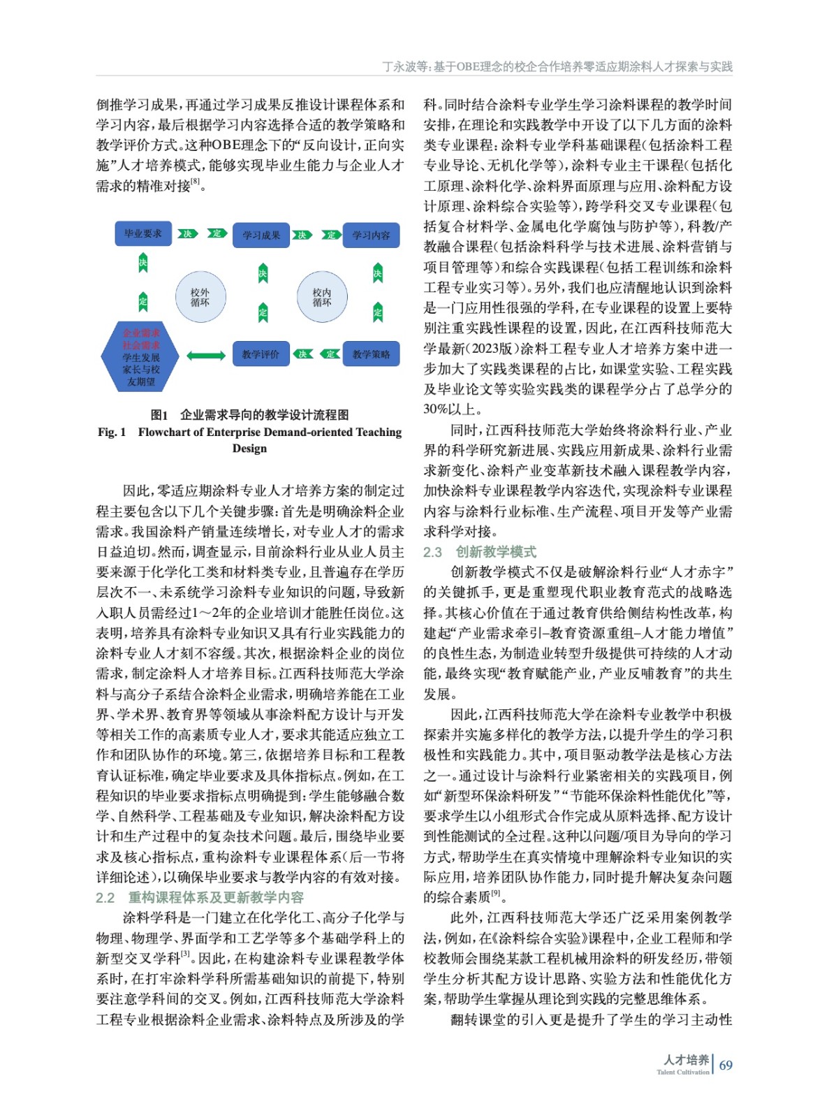 摘要:論述了當(dāng)前涂料行業(yè)人才需求現(xiàn)狀及涂料類人才培養(yǎng)存在的問題;闡述了基于成果導(dǎo)向教育(OBE)理念的校企合作人才培養(yǎng)模式;介紹了基于OBE理念的校企合作模式在江西科技師范大學(xué)培養(yǎng)零適應(yīng)期涂料人才方面的探索與實踐,包括制定遵循OBE理念的校企合作人才培養(yǎng)方案、重構(gòu)課程體系、創(chuàng)新教學(xué)模式、建立評價體系等具體措施。實踐結(jié)果表明,基于OBE理念的校企合作模式有效縮短了大學(xué)畢業(yè)生適應(yīng)期,提高了就業(yè)競爭力,為涂料行業(yè)輸送了高素質(zhì)應(yīng)用型人才。