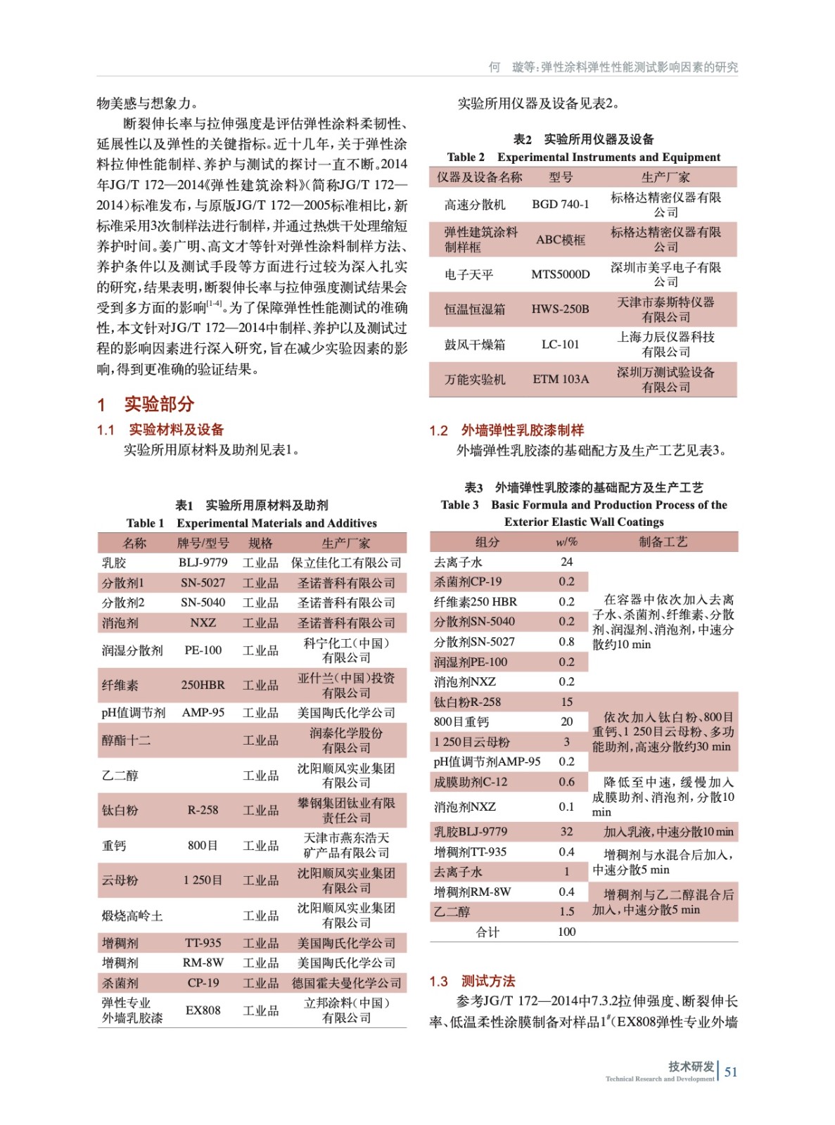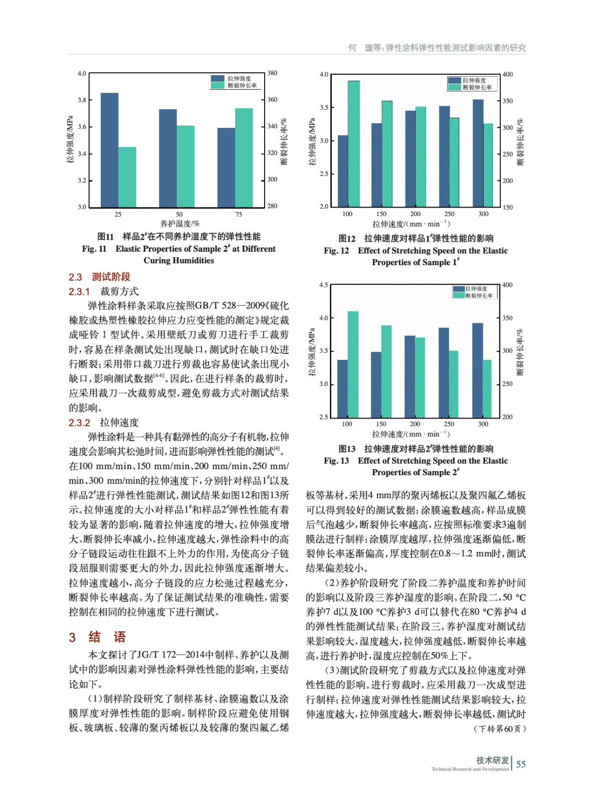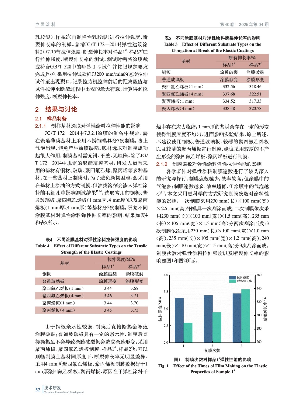 摘要:為了降低彈性涂料測試標(biāo)準(zhǔn)JG/T 172—2014《彈性建筑涂料》中的彈性性能測試誤差,針對制樣、養(yǎng)護(hù)以及測試階段對彈性性能測試影響因素進(jìn)行探究。結(jié)果表明,制樣過程中需選擇合適的基材,嚴(yán)格控制制膜次數(shù)以及成膜厚度;養(yǎng)護(hù)過程中,需控制反面養(yǎng)護(hù)的養(yǎng)護(hù)溫度、養(yǎng)護(hù)時間以及測試前的養(yǎng)護(hù)濕度;測試過程中,需控制剪裁方式以及拉伸速度。針對制樣、養(yǎng)護(hù)以及測試階段進(jìn)行嚴(yán)格控制,即可得到較為準(zhǔn)確的彈性涂料彈性性能測試結(jié)果。