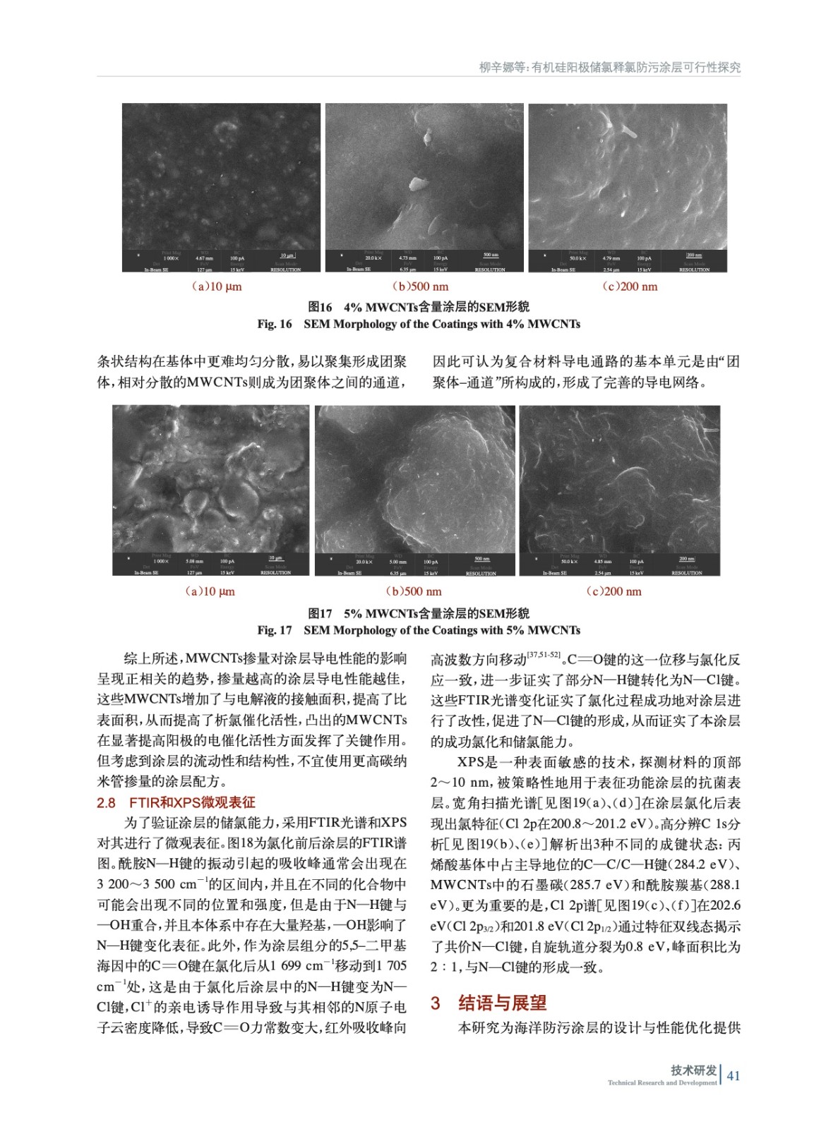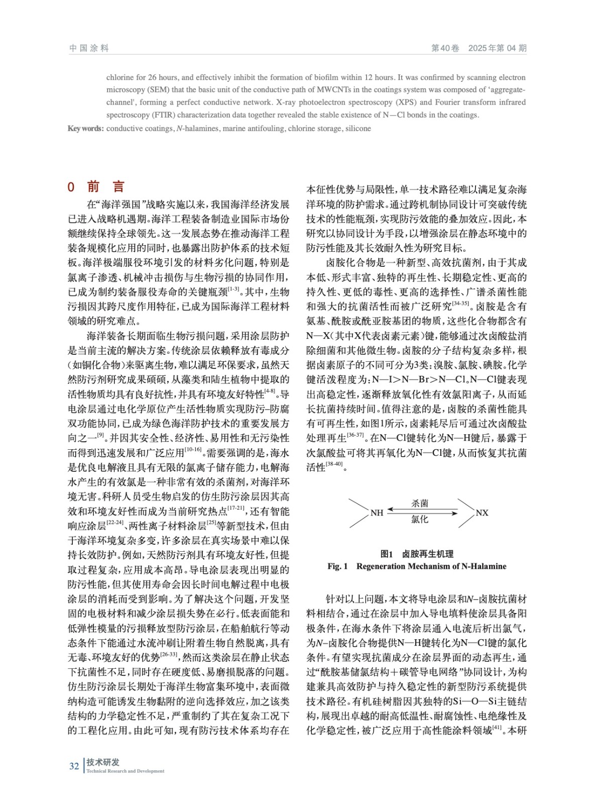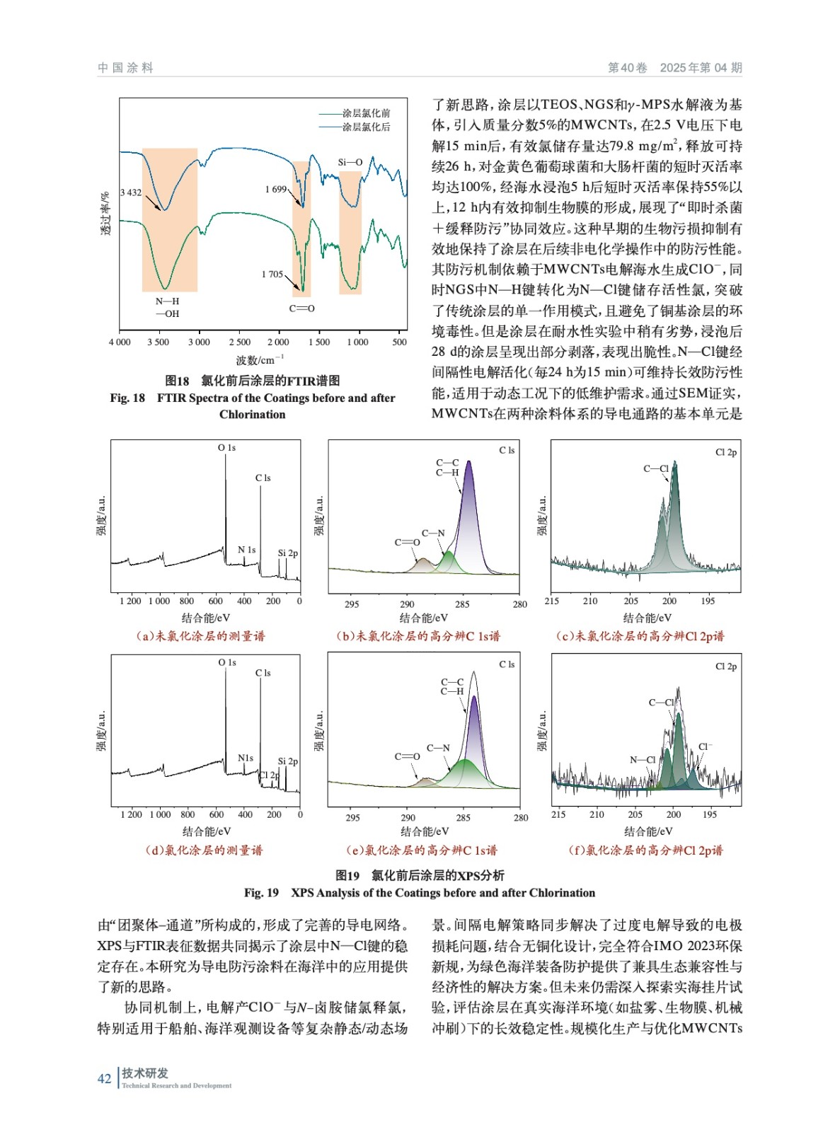 摘要:本研究基于導(dǎo)電涂層防污技術(shù),提出“酰胺基儲氯結(jié)構(gòu)+碳管導(dǎo)電網(wǎng)絡(luò)”協(xié)同機(jī)制,開發(fā)了可儲氯釋氯防污涂層,實(shí)現(xiàn)了防生物污損與生態(tài)安全的統(tǒng)一。以可在次氯酸溶液中將N—H鍵轉(zhuǎn)化為N—Cl鍵的N–鹵胺化合物為核心儲氯單元,結(jié)合多壁碳納米管(MWCNTs)構(gòu)建導(dǎo)電網(wǎng)絡(luò),采用溶膠–凝膠法進(jìn)行硅烷水解構(gòu)筑復(fù)合涂層基底。突破傳統(tǒng)涂層的單一作用模式,將MWCNTs導(dǎo)電涂層作為陽極,在外加電場下電解海水原位生成次氯酸根,與N–鹵胺儲氯體系形成協(xié)同防污機(jī)制。并通過電化學(xué)測試定量解析了海水環(huán)境中MWCNTs導(dǎo)電涂層的析氯電位,驗(yàn)證了該體系在低能耗條件下持續(xù)產(chǎn)氯的可行性。實(shí)驗(yàn)結(jié)果表明,涂層經(jīng)2.5 V電解15 min將N—H鍵向N—Cl鍵轉(zhuǎn)化完成儲氯后,涂層有效氯儲存量達(dá)79.8 mg/m2,對大腸桿菌和金黃色葡萄球菌的接觸殺滅率均達(dá)100%,海水中浸泡5 h后依然有55%以上的細(xì)菌殺滅率。一次儲氯可維持有效氯勻速緩釋26 h,12 h內(nèi)有效抑制生物膜的形成。通過掃描電子顯微鏡(SEM)證實(shí),MWCNTs在涂料體系的導(dǎo)電通路的基本單元是由“團(tuán)聚體–通道”所構(gòu)成的,形成了完善的導(dǎo)電網(wǎng)絡(luò)。X射線光電子能譜(XPS)與傅里葉變換紅外光譜(FTIR)表征數(shù)據(jù)共同揭示了涂層中N—Cl鍵的穩(wěn)定存在。