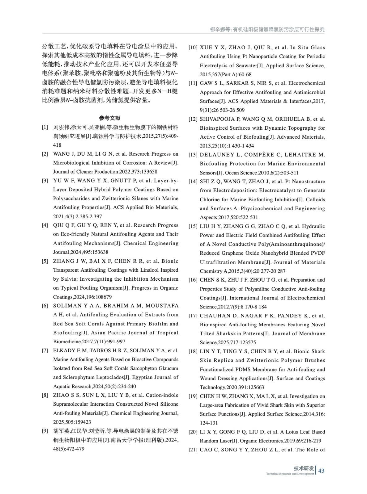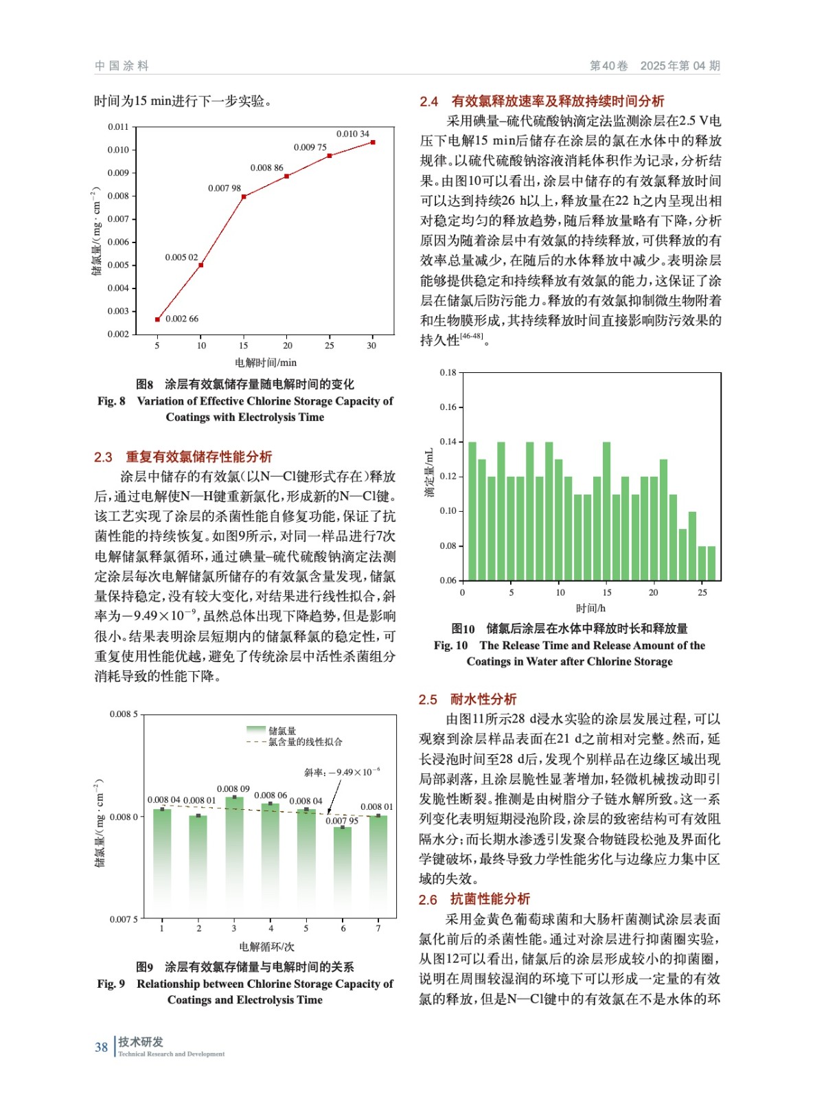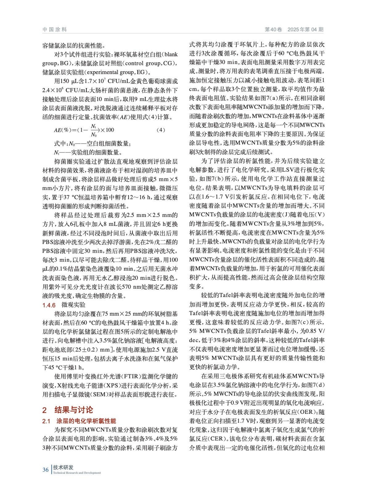 摘要:本研究基于導(dǎo)電涂層防污技術(shù),提出“酰胺基儲氯結(jié)構(gòu)+碳管導(dǎo)電網(wǎng)絡(luò)”協(xié)同機(jī)制,開發(fā)了可儲氯釋氯防污涂層,實(shí)現(xiàn)了防生物污損與生態(tài)安全的統(tǒng)一。以可在次氯酸溶液中將N—H鍵轉(zhuǎn)化為N—Cl鍵的N–鹵胺化合物為核心儲氯單元,結(jié)合多壁碳納米管(MWCNTs)構(gòu)建導(dǎo)電網(wǎng)絡(luò),采用溶膠–凝膠法進(jìn)行硅烷水解構(gòu)筑復(fù)合涂層基底。突破傳統(tǒng)涂層的單一作用模式,將MWCNTs導(dǎo)電涂層作為陽極,在外加電場下電解海水原位生成次氯酸根,與N–鹵胺儲氯體系形成協(xié)同防污機(jī)制。并通過電化學(xué)測試定量解析了海水環(huán)境中MWCNTs導(dǎo)電涂層的析氯電位,驗(yàn)證了該體系在低能耗條件下持續(xù)產(chǎn)氯的可行性。實(shí)驗(yàn)結(jié)果表明,涂層經(jīng)2.5 V電解15 min將N—H鍵向N—Cl鍵轉(zhuǎn)化完成儲氯后,涂層有效氯儲存量達(dá)79.8 mg/m2,對大腸桿菌和金黃色葡萄球菌的接觸殺滅率均達(dá)100%,海水中浸泡5 h后依然有55%以上的細(xì)菌殺滅率。一次儲氯可維持有效氯勻速緩釋26 h,12 h內(nèi)有效抑制生物膜的形成。通過掃描電子顯微鏡(SEM)證實(shí),MWCNTs在涂料體系的導(dǎo)電通路的基本單元是由“團(tuán)聚體–通道”所構(gòu)成的,形成了完善的導(dǎo)電網(wǎng)絡(luò)。X射線光電子能譜(XPS)與傅里葉變換紅外光譜(FTIR)表征數(shù)據(jù)共同揭示了涂層中N—Cl鍵的穩(wěn)定存在。