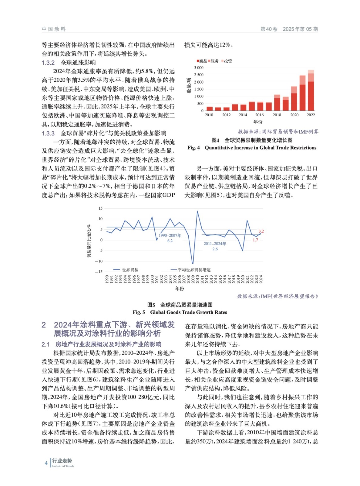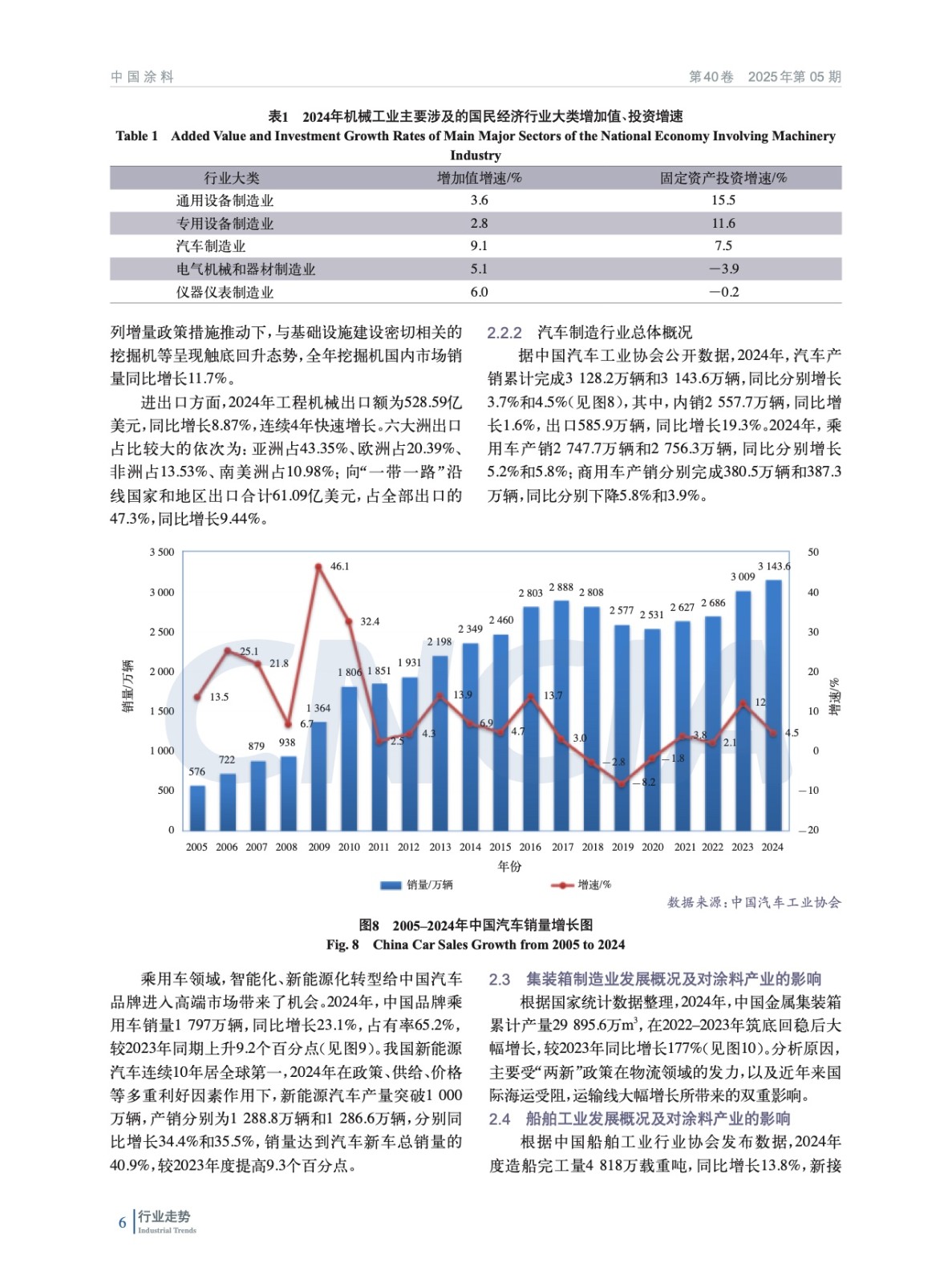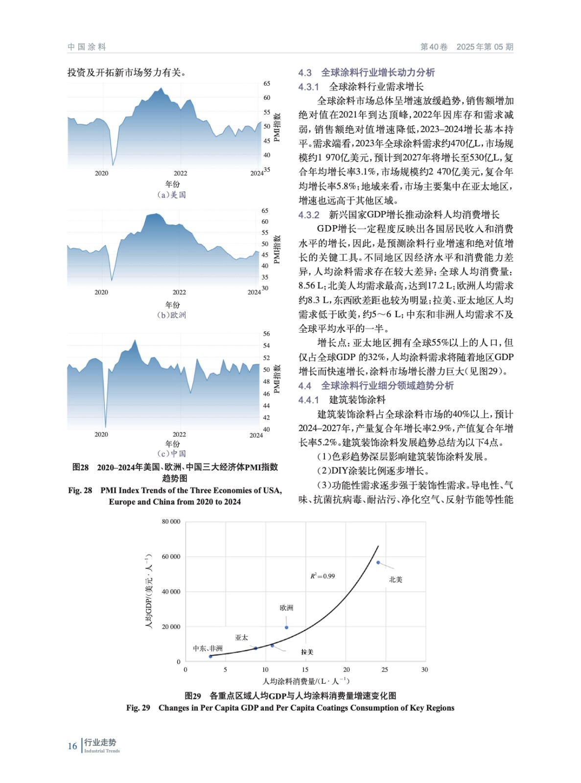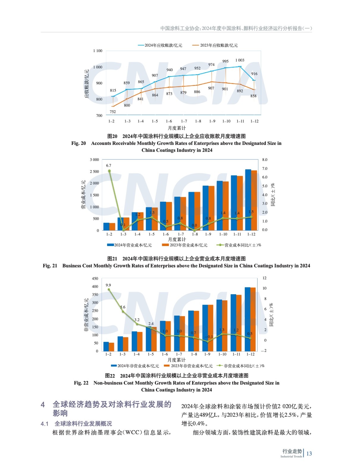 摘要:簡(jiǎn)析了2024年中國(guó)宏觀經(jīng)濟(jì)及外部環(huán)境發(fā)展情況,概括介紹了2024年房地產(chǎn)、機(jī)械、集裝箱、船舶、家具、新能源等涂料重點(diǎn)下游行業(yè)、新興領(lǐng)域發(fā)展概況及對(duì)涂料行業(yè)的影響,重點(diǎn)分析了2024年度中國(guó)涂料行業(yè)發(fā)展和進(jìn)出口情況。綜述了全球涂料行業(yè)發(fā)展概況,對(duì)2024年全球涂料行業(yè)發(fā)展影響因素、全球涂料行業(yè)增長(zhǎng)動(dòng)力、全球涂料行業(yè)細(xì)分領(lǐng)域趨勢(shì)進(jìn)行了分析。最后對(duì)涂料上游鈦白粉、氧化鐵、丙烯酸乳液和環(huán)氧樹(shù)脂等重點(diǎn)原材料領(lǐng)域發(fā)展情況進(jìn)行了概述,并對(duì)中國(guó)涂料行業(yè)特征和發(fā)展趨勢(shì)進(jìn)行了分析和預(yù)測(cè)。