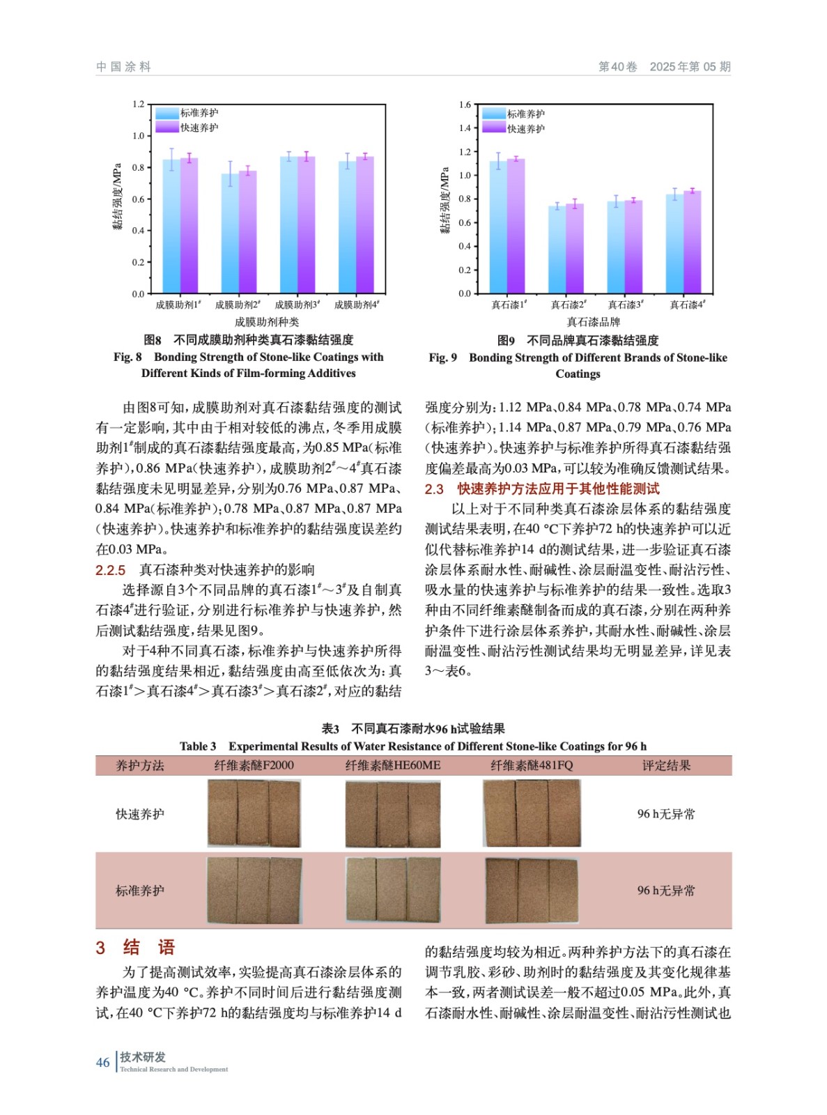 摘要:黏結(jié)強度是評價真石漆涂層體系性能的關(guān)鍵指標之一,長達14 d的養(yǎng)護周期對真石漆黏結(jié)強度等性能測試造成較大程度的延遲,因此考察通過適當提高養(yǎng)護溫度,對真石漆養(yǎng)護時間進行一定程度的縮短。實驗測試了養(yǎng)護溫度為40 ℃時不同養(yǎng)護時間的真石漆涂層體系黏結(jié)強度,確定了最佳快速養(yǎng)護時間。將該快速養(yǎng)護方法應(yīng)用于多種真石漆樣品的黏結(jié)強度測試,驗證得出快速養(yǎng)護與標準養(yǎng)護條件下測得的黏結(jié)強度相差較小。采用該快速養(yǎng)護方法得到的樣板耐水性、耐堿性、涂層耐溫變性、耐沾污性測試結(jié)果均與標準養(yǎng)護樣板測試結(jié)果相近。該快速養(yǎng)護方法的應(yīng)用有效縮短了真石漆涂層體系的測試周期,提高了真石漆產(chǎn)品的測試效率。