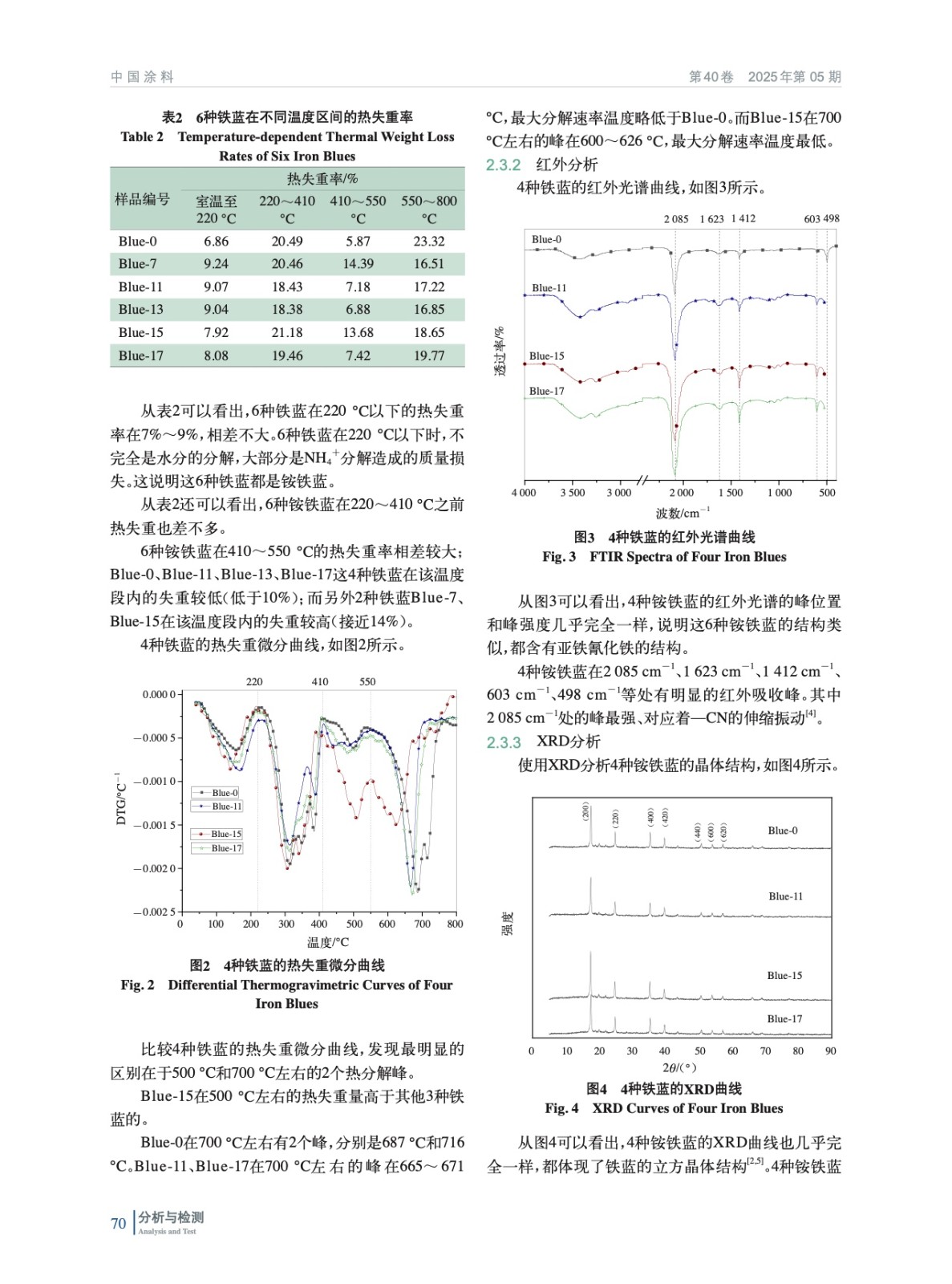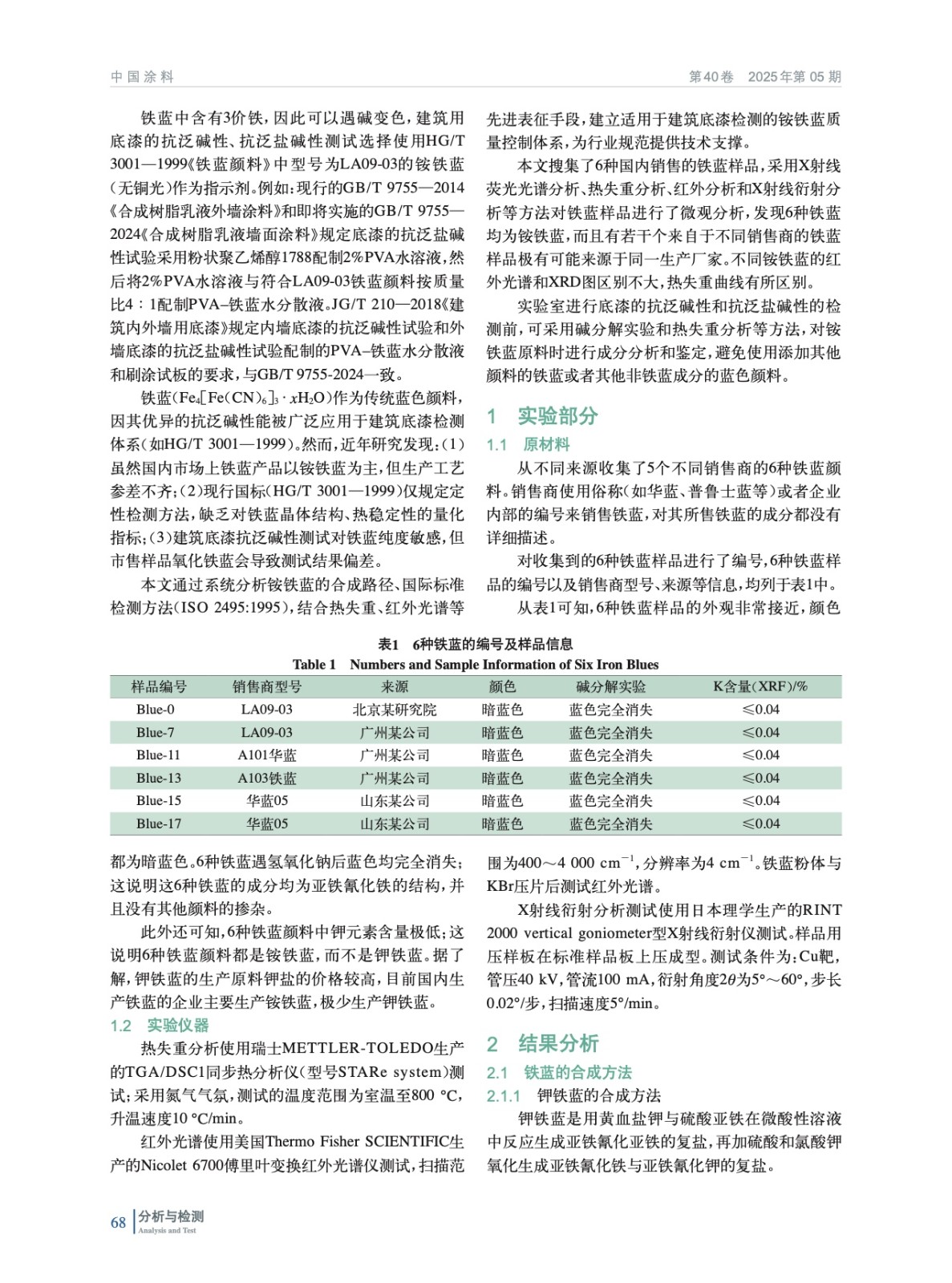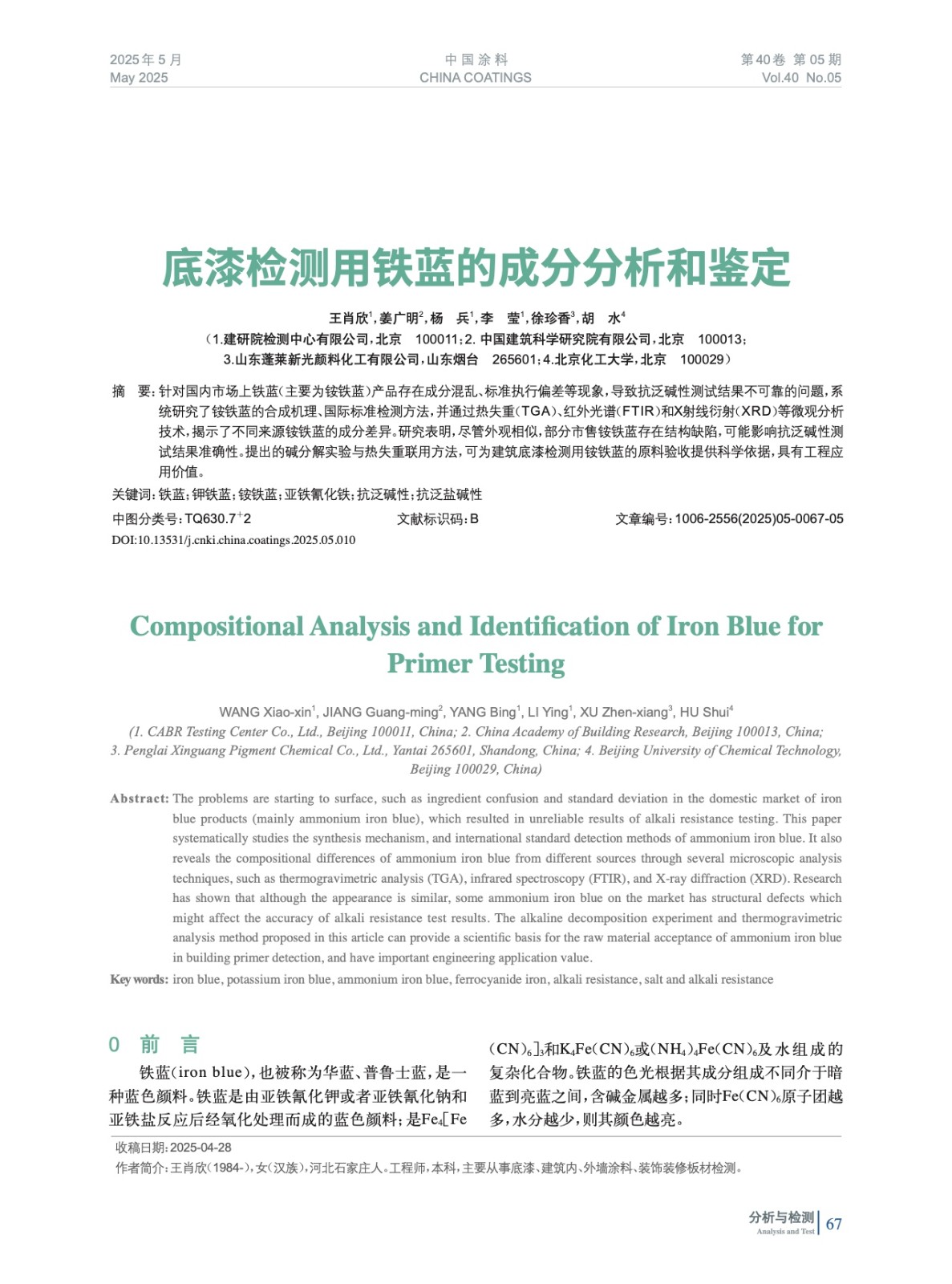 摘要:針對(duì)國(guó)內(nèi)市場(chǎng)上鐵藍(lán)(主要為銨鐵藍(lán))產(chǎn)品存在成分混亂、標(biāo)準(zhǔn)執(zhí)行偏差等現(xiàn)象,導(dǎo)致抗泛堿性測(cè)試結(jié)果不可靠的問題,系統(tǒng)研究了銨鐵藍(lán)的合成機(jī)理、國(guó)際標(biāo)準(zhǔn)檢測(cè)方法,并通過熱失重(TGA)、紅外光譜(FTIR)和X射線衍射(XRD)等微觀分析技術(shù),揭示了不同來源銨鐵藍(lán)的成分差異。研究表明,盡管外觀相似,部分市售銨鐵藍(lán)存在結(jié)構(gòu)缺陷,可能影響抗泛堿性測(cè)試結(jié)果準(zhǔn)確性。提出的堿分解實(shí)驗(yàn)與熱失重聯(lián)用方法,可為建筑底漆檢測(cè)用銨鐵藍(lán)的原料驗(yàn)收提供科學(xué)依據(jù),具有工程應(yīng)用價(jià)值。