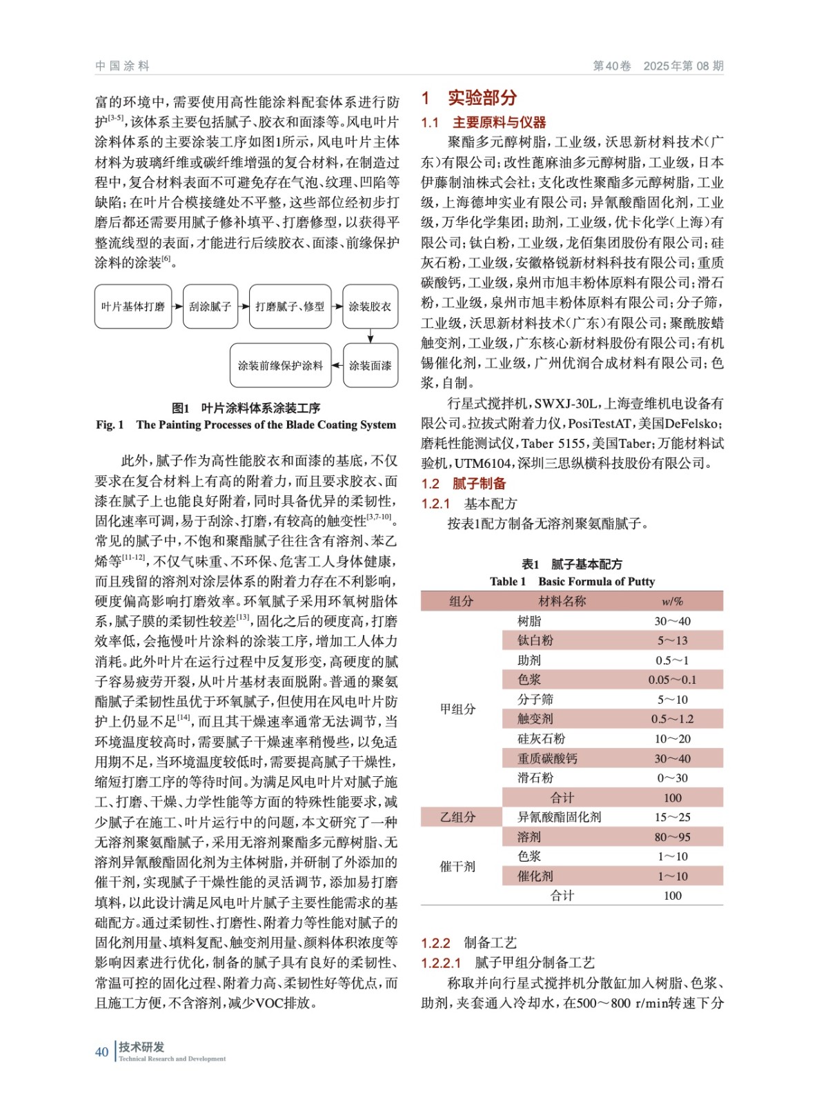 摘要:采用無溶劑聚酯多元醇樹脂和無溶劑異氰酸酯固化劑制備了無溶劑聚氨酯膩?zhàn)?。對樹脂體系、填料復(fù)配比例、觸變劑、催干劑等進(jìn)行研究,并優(yōu)化配方。實(shí)驗(yàn)結(jié)果表明,當(dāng)固化劑過量5%(質(zhì)量分?jǐn)?shù),后同),復(fù)配填料采用硅灰石粉10%~20%、重質(zhì)碳酸鈣30%~40%,觸變劑用量0.9%,催干劑添加量0.45%~0.75%時,膩?zhàn)泳哂凶罴丫C合性能。經(jīng)過檢測,膩?zhàn)庸腆w分99.9%,柔韌性2 mm,附著力10 MPa,固化速率可根據(jù)現(xiàn)場施工環(huán)境按需調(diào)整。所研發(fā)的膩?zhàn)涌捎糜陲L(fēng)電葉片、玻璃鋼儲罐等裝備。