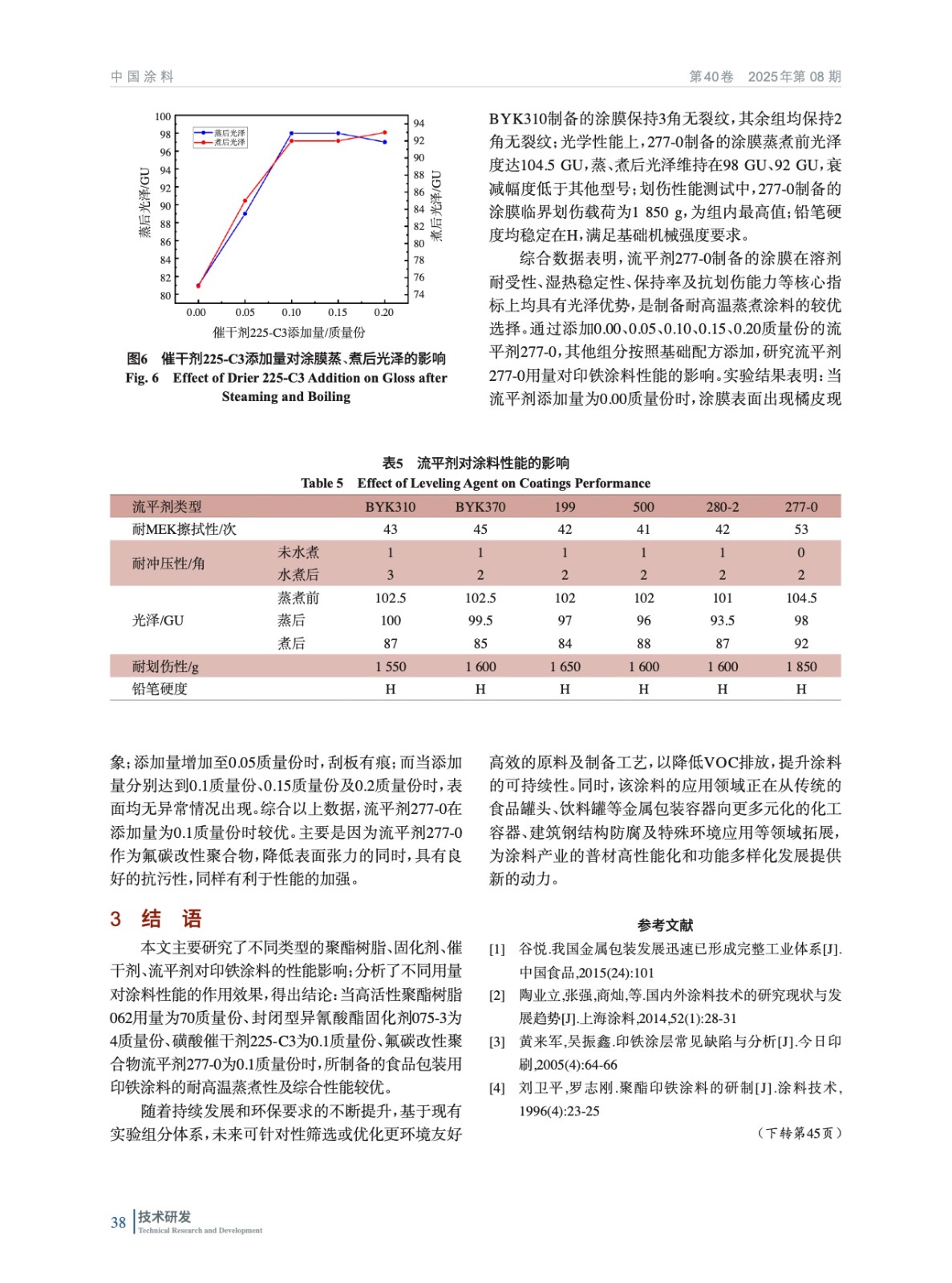 摘要:研究了不同型號的聚酯樹脂、固化劑、催干劑及流平劑對食品包裝用耐高溫蒸煮聚酯印鐵涂料性能的影響,并分析了各組分用量對其性能的作用效果。研究發(fā)現(xiàn):高活性聚酯樹脂062型在70質(zhì)量份時制備的涂膜耐高溫蒸煮性、耐化學溶劑性、抗沖壓開裂性及光澤穩(wěn)定性較優(yōu);4質(zhì)量份封閉型異氰酸酯固化劑075-3與0.1質(zhì)量份磺酸催干劑225-C3協(xié)同增強涂膜交聯(lián)密度,提升機械強度與固化效率;氟碳改性聚合物流平劑277-0在0.1質(zhì)量份時有效消除涂膜橘皮現(xiàn)象與刮板痕跡,達到高平整度。