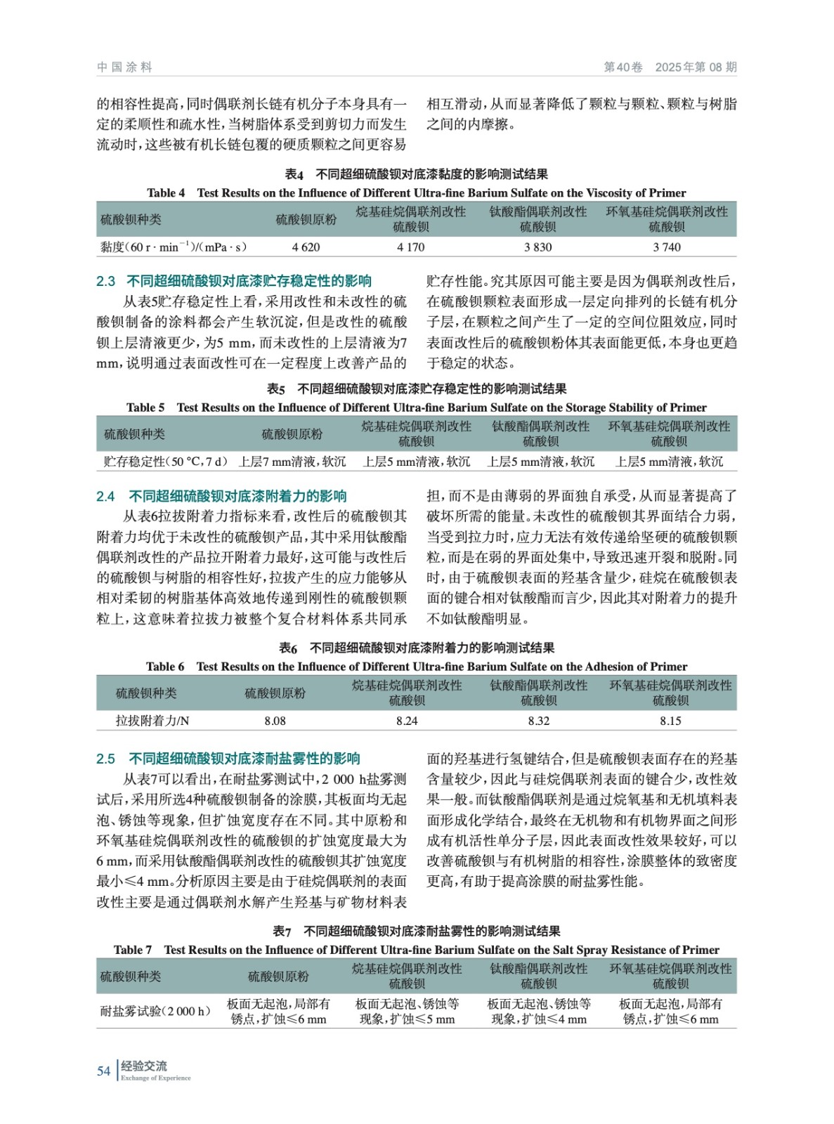 摘要:對比了不同改性劑改性超細(xì)硫酸鋇與未做處理的超細(xì)硫酸鋇原粉在溶劑型酚醛環(huán)氧底漆中的應(yīng)用性能。對其分散性、貯存穩(wěn)定性、耐沖擊、彎曲、附著力等常規(guī)性能,以及耐鹽霧性能、耐酸堿性等防腐蝕性能進行了對比研究。結(jié)果顯示,采用各類硅烷和鈦酸酯偶聯(lián)劑對硫酸鋇進行表面改性后,對其分散性、耐沖擊強度、彎曲強度、耐酸堿性等性能沒有明顯提升,但是鈦酸酯偶聯(lián)劑改性的硫酸鋇后降低涂膜的黏度,改善產(chǎn)品的貯存穩(wěn)定性、拉拔附著力以及耐鹽霧性能。