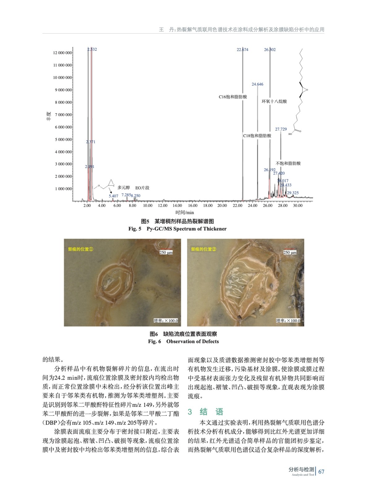 摘要:探討了熱裂解氣質(zhì)聯(lián)用色譜(Py-GC/MS)技術(shù)在涂料成分解析以及涂膜缺陷分析中的應(yīng)用,其可分析涂料及原材料的類型、相關(guān)單體,另外也可根據(jù)裂解碎片得到結(jié)構(gòu)指向,針對(duì)涂膜表面缺陷以及涂料現(xiàn)場(chǎng)應(yīng)用問題進(jìn)行快速分析與解決。