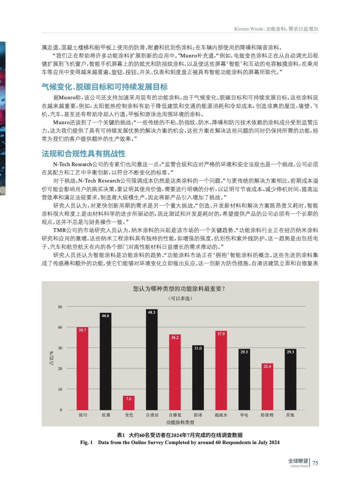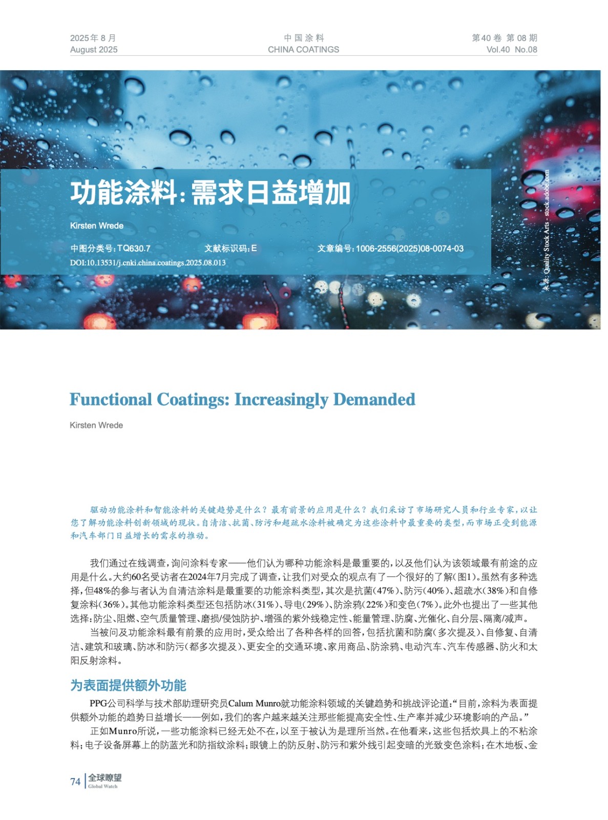 摘要:編者按:驅(qū)動(dòng)功能涂料和智能涂料的關(guān)鍵趨勢(shì)是什么?最有前景的應(yīng)用是什么?我們采訪(fǎng)了市場(chǎng)研究人員和行業(yè)專(zhuān)家,以讓您了解功能涂料創(chuàng)新領(lǐng)域的現(xiàn)狀。自清潔、抗菌、防污和超疏水涂料被確定為這些涂料中最重要的類(lèi)型,而市場(chǎng)正受到能源和汽車(chē)部門(mén)日益增長(zhǎng)的需求的推動(dòng)。