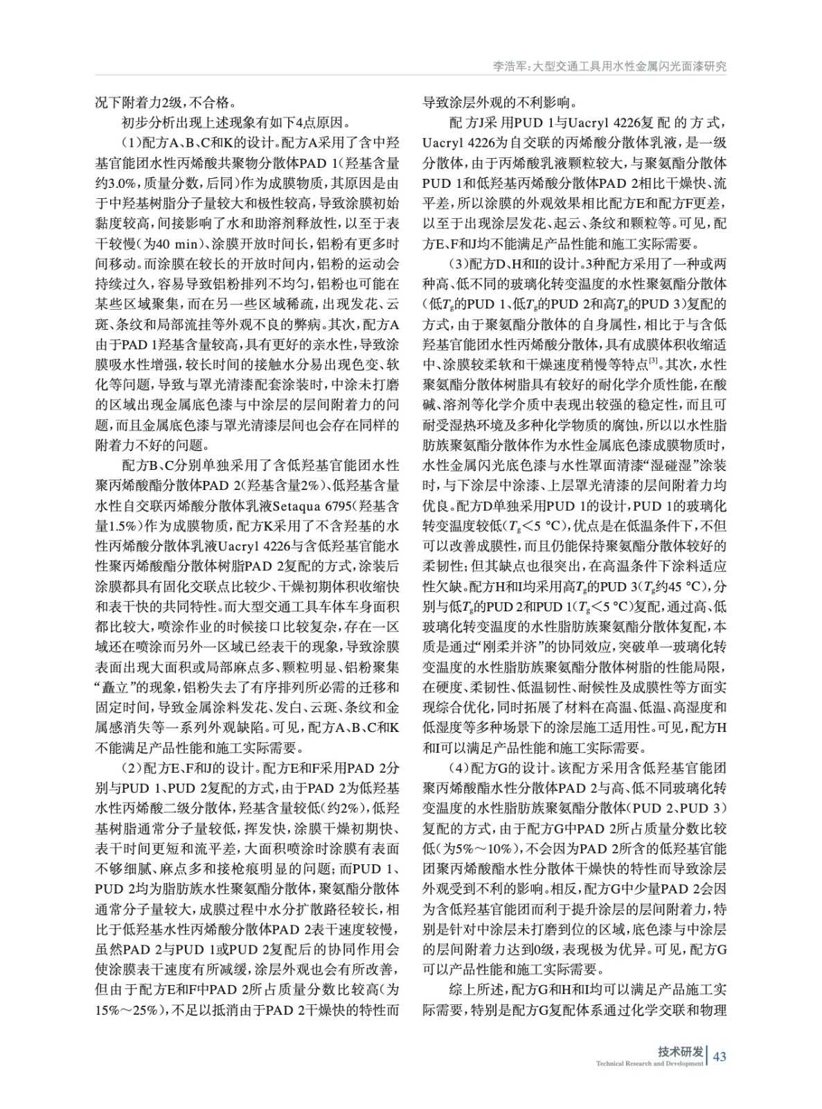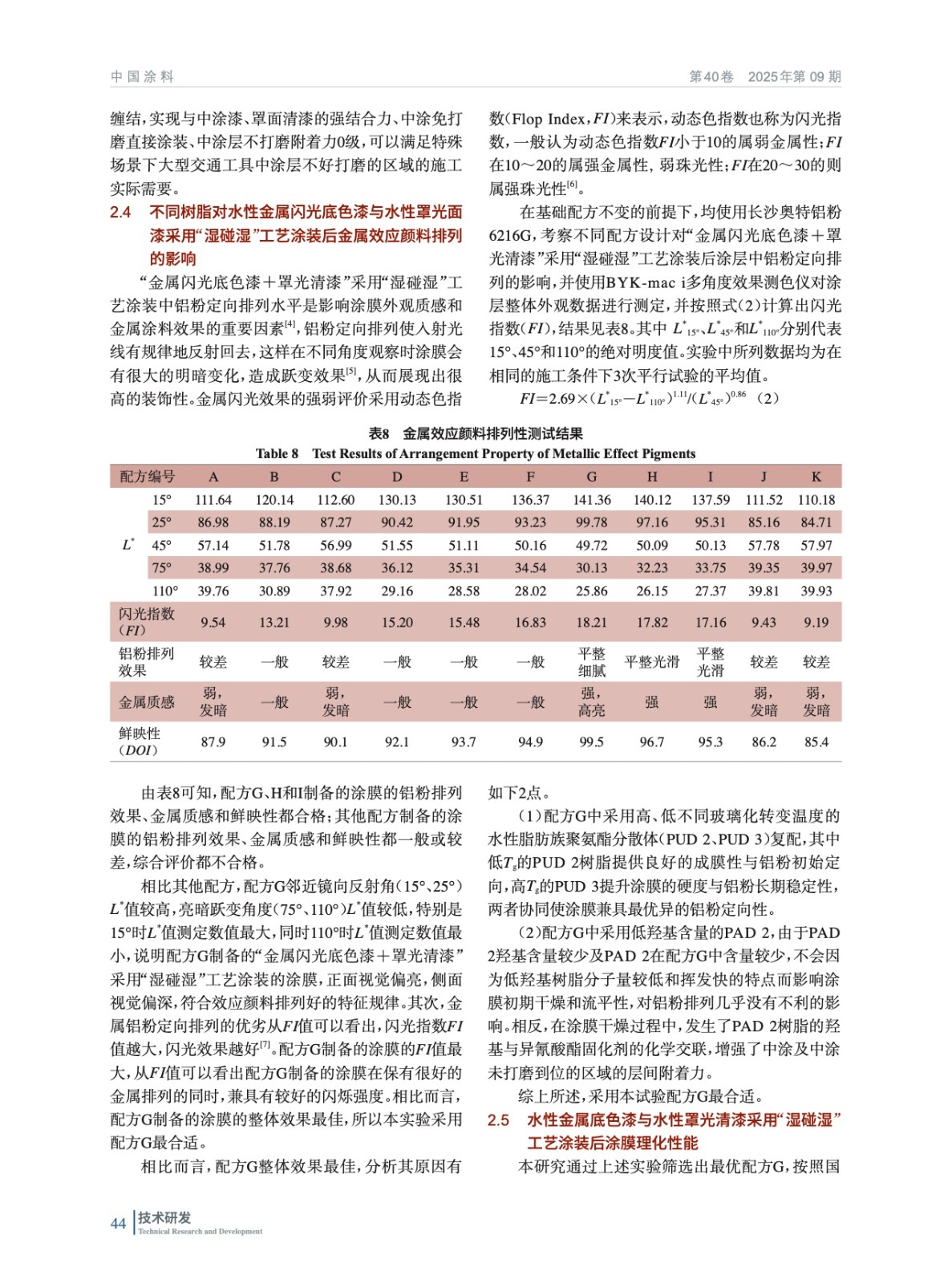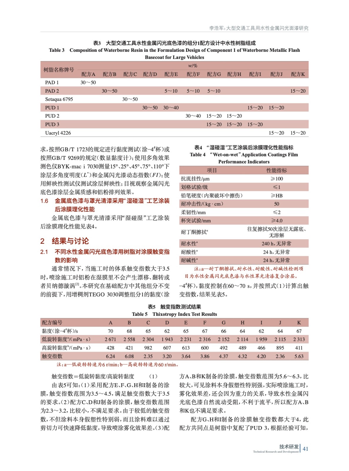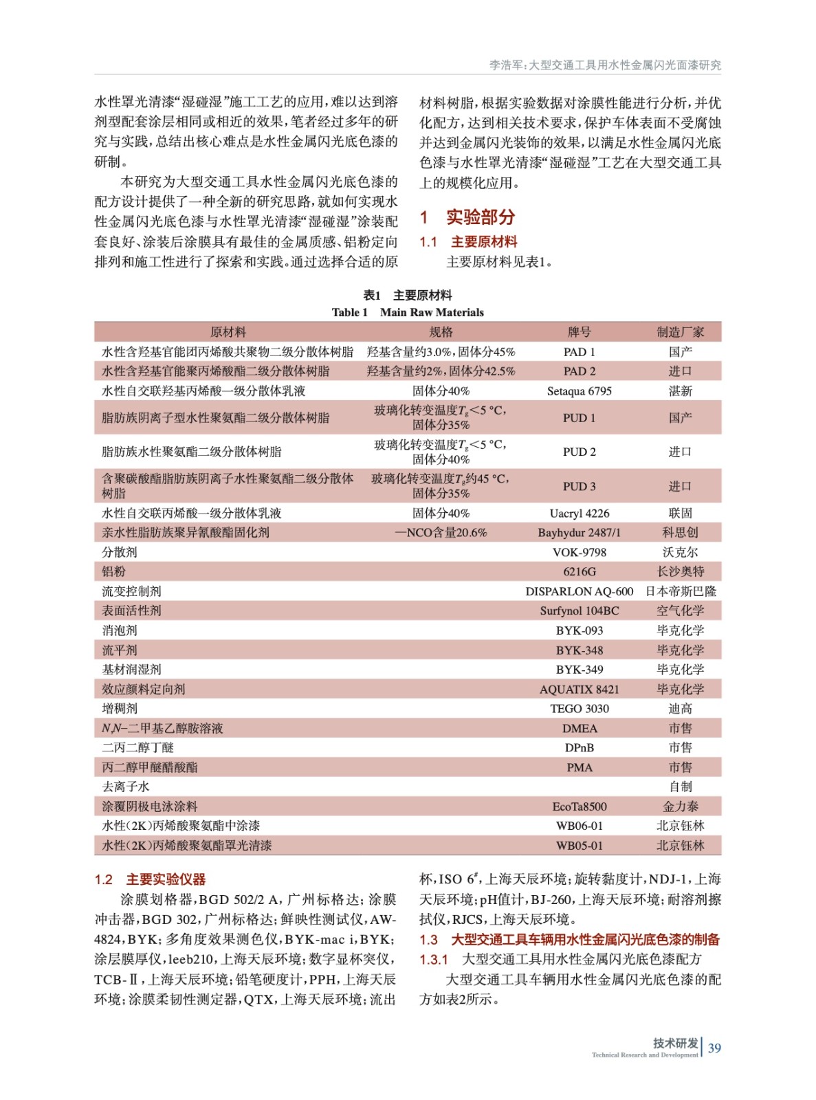 摘要:主要通過研究中、低羥基含量水性丙烯酸分散體樹脂、水性丙烯酸分散體乳液和高、低不同的玻璃化轉(zhuǎn)變溫度的水性聚氨酯分散體等水性樹脂對(duì)水性金屬閃光底色漆觸變指數(shù)、抗流掛性的影響,以及對(duì)水性金屬閃光底色漆與水性罩光面漆采用“濕碰濕”工藝時(shí)干燥性及涂裝后金屬效應(yīng)顏料排列外觀效果的影響,采用遞進(jìn)式研究方法,制備了一種新型水性金屬閃光底色漆。該“濕碰濕”配套水性罩光清漆,整體配套面漆效果已通過GB/T 13492—2025《汽車用涂料》標(biāo)準(zhǔn)中核心項(xiàng)目驗(yàn)證。