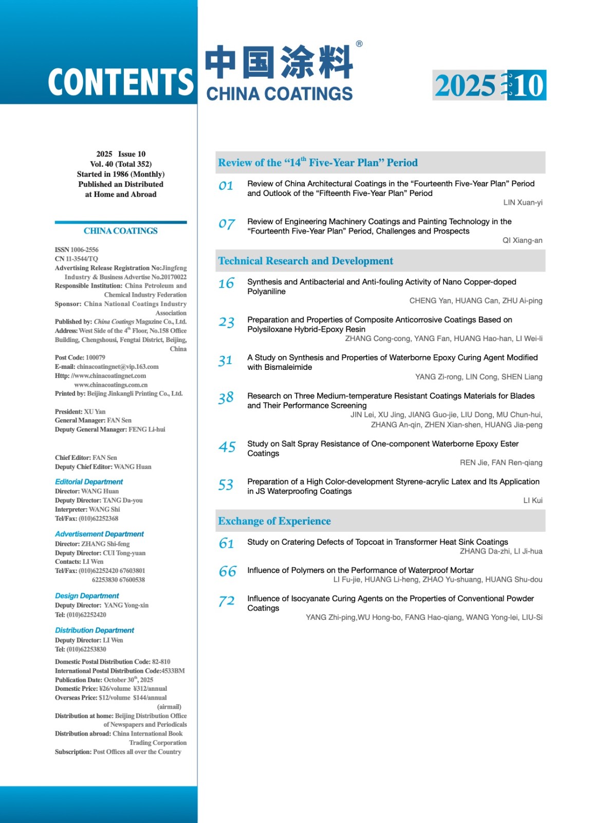 《中國涂料》2025年第10期版權(quán)及目錄