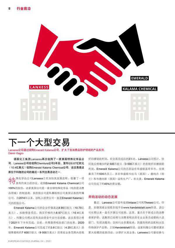Lanxess公司通過收購Emerald Kalama公司,擴大了在消費品防護(hù)領(lǐng)域的產(chǎn)品系列