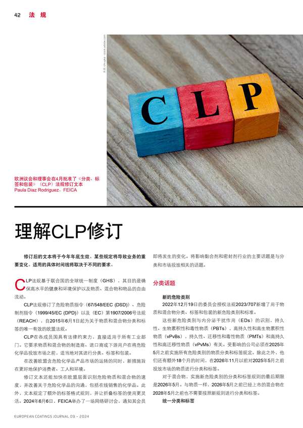 歐洲議會和理事會在4月批準(zhǔn)了《分類、標(biāo)簽和包裝》(CLP)法規(guī)修訂文本