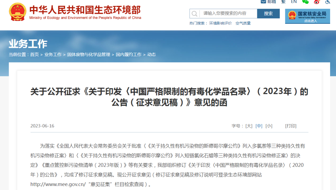 日前,中華人民共和國生態(tài)環(huán)境部發(fā)布公告,公開征求《中國嚴格限制的有毒化學品名錄》(2023年)(征求意見稿)。意見指出: